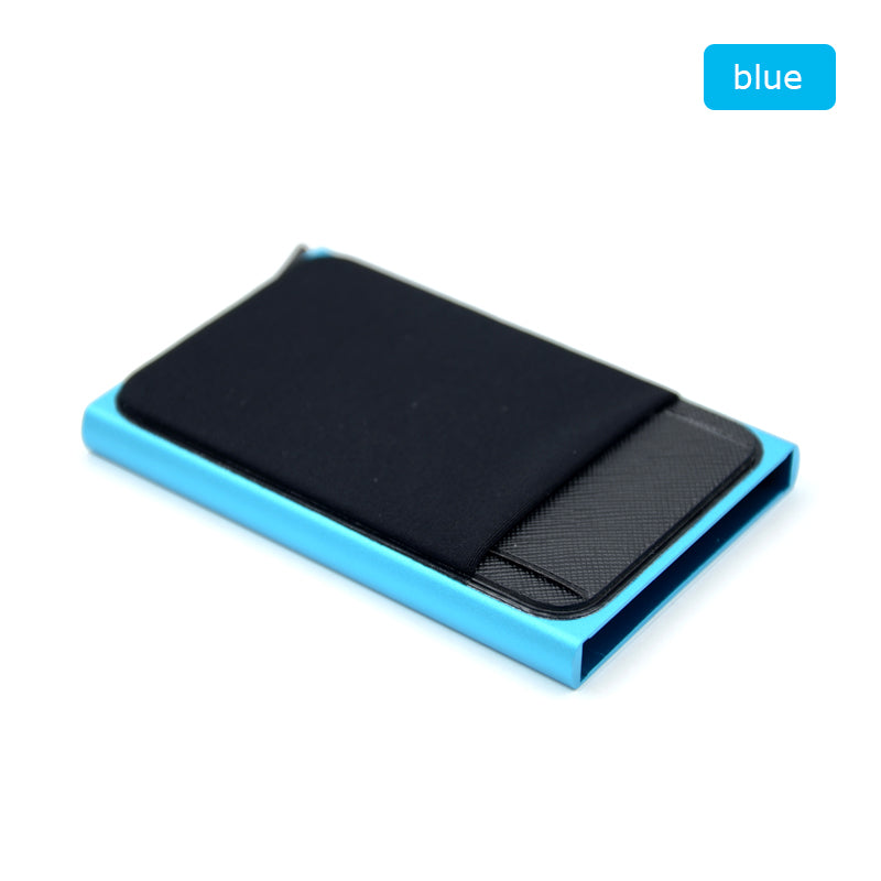 This slim aluminum wallet features a compact design with an elastic back pouch, making it ideal for holding ID and credit cards. It offers RFID protection to keep your information secure. The wallet has an automatic pop-up mechanism for easy access to your bank cards and can hold 2 to 6 banknotes along with 4 to 8 credit cards.