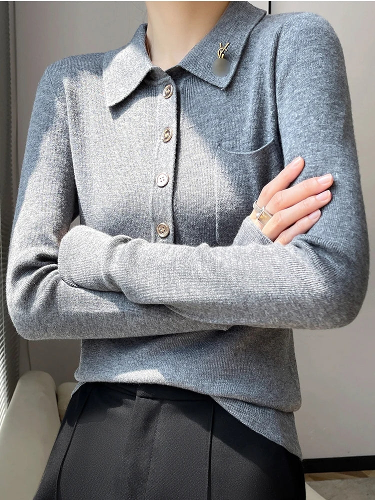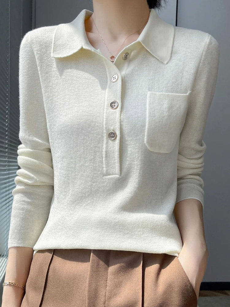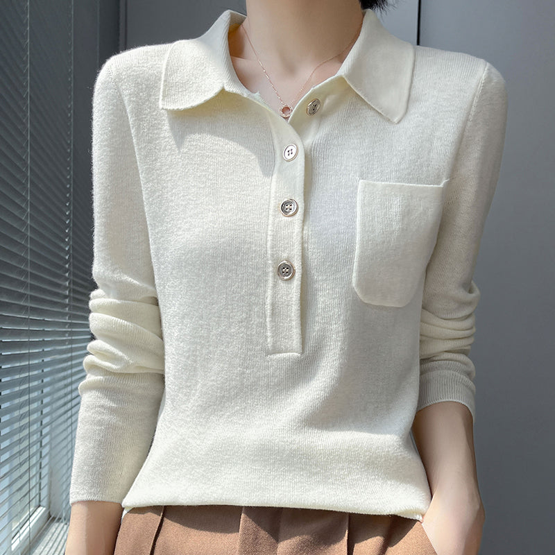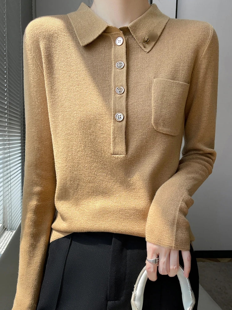 Solid Color Wool Knitwear Soft Sweater .This is a description of a women's sweater made from 100% pure merino wool. It features a soft texture, a polo collar, and is a pullover style. Designed for autumn and winter, it is a casual knit top available in a solid color with a regular fit, ideal for female knitwear enthusiasts.