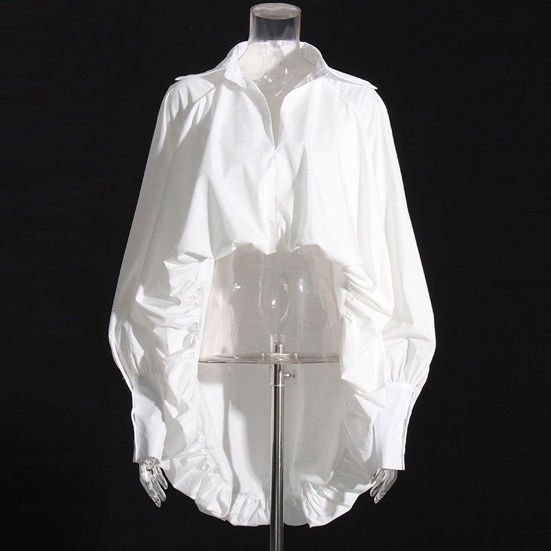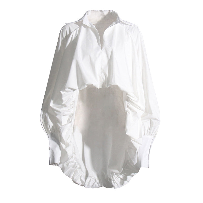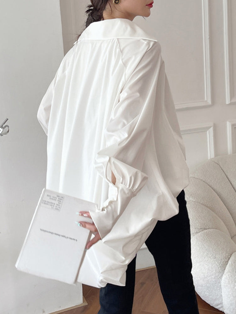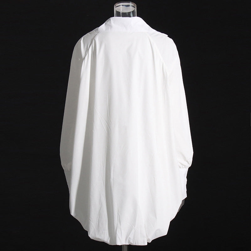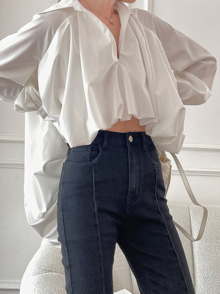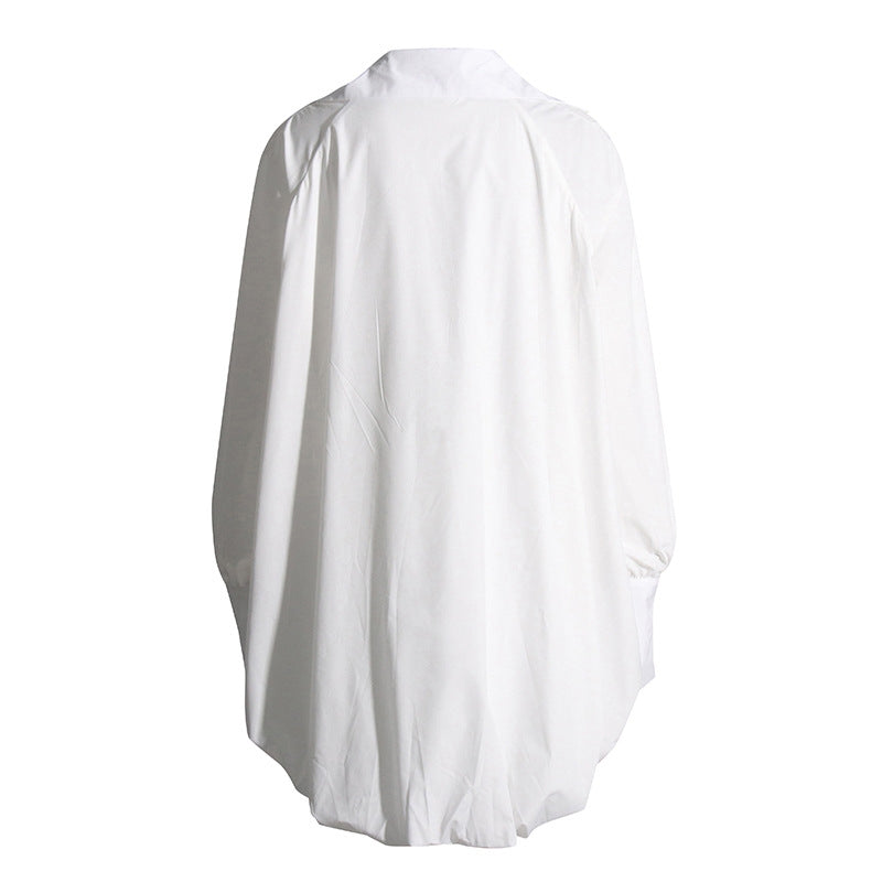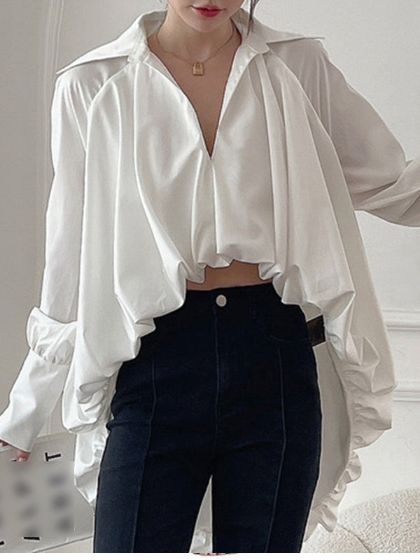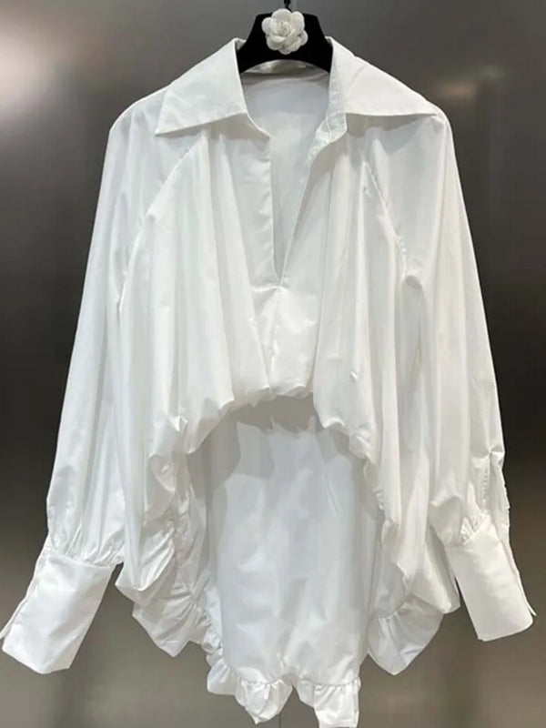 White Casual Irregular Hem Shirt For Women V Neck Black Long Sleeve Solid Asymmetrical Blouses
