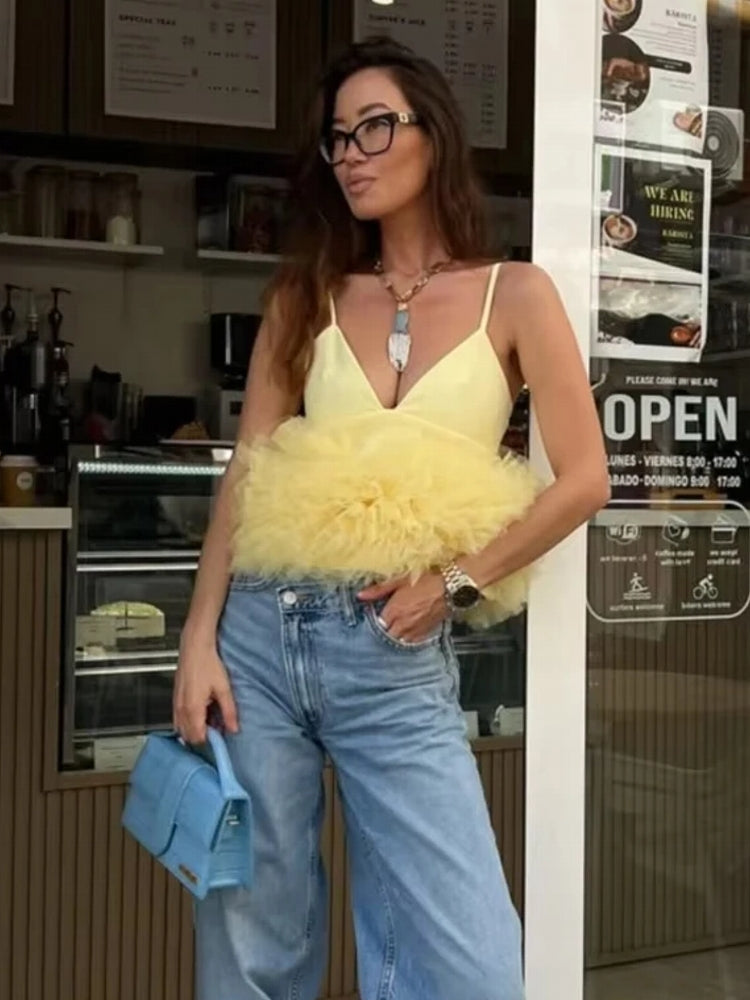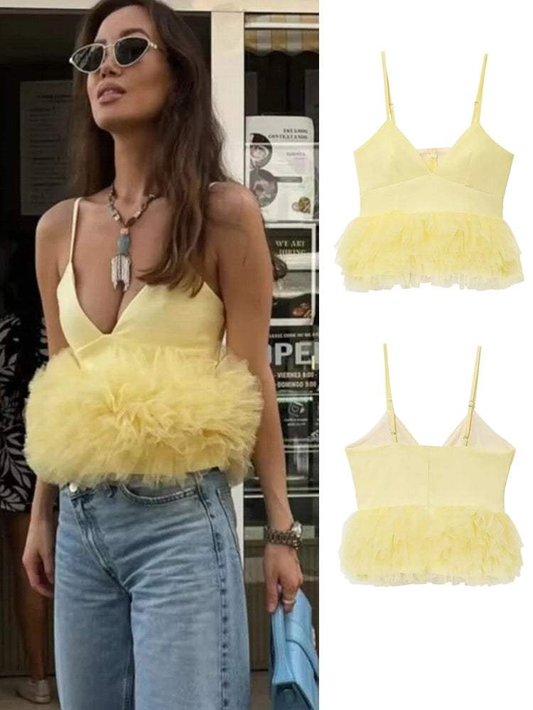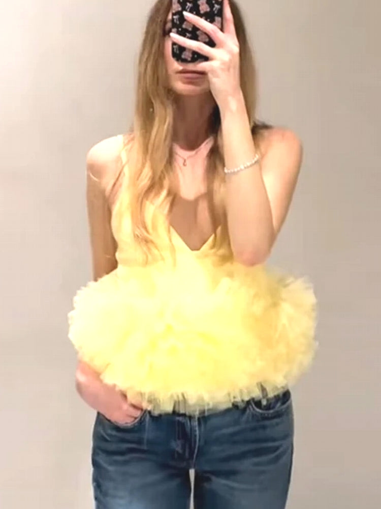 Yellow Puffy Mesh Tops For Women Strap Ruffle Crop Top