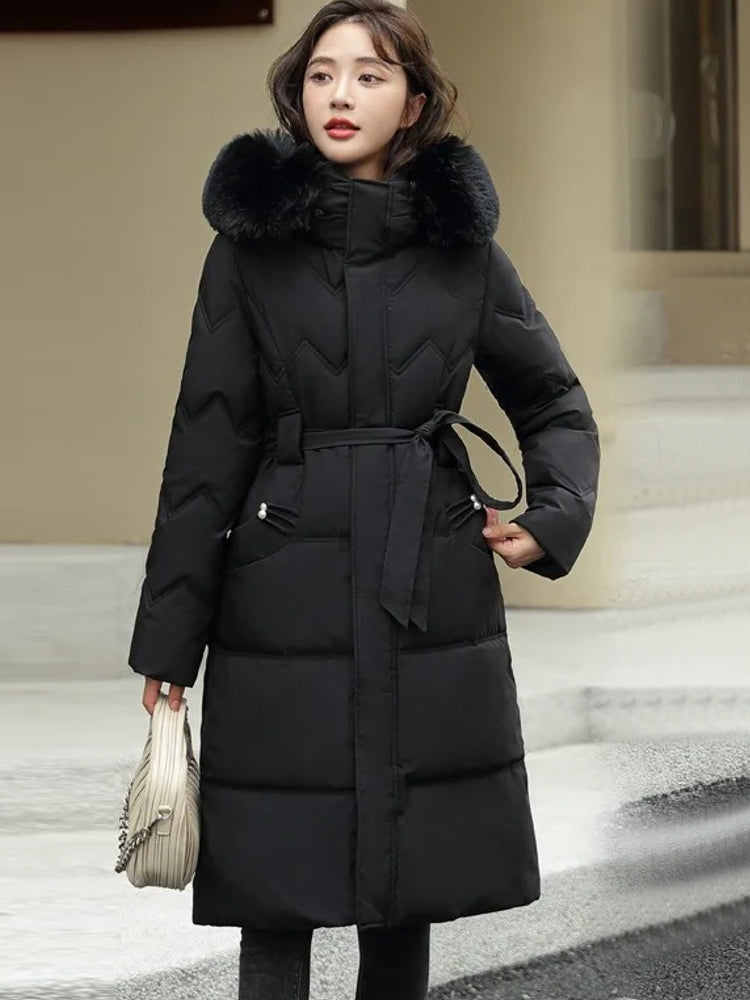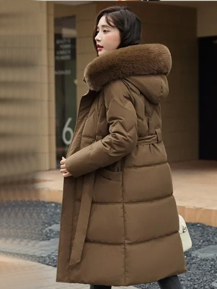 This stylish women's winter coat features a large fur collar and a slim fit, exuding elegance. Combining warmth and sophistication, it boasts a hood and thick cotton fabric, making it an ideal choice for staying warm and comfortable during the long winter months.