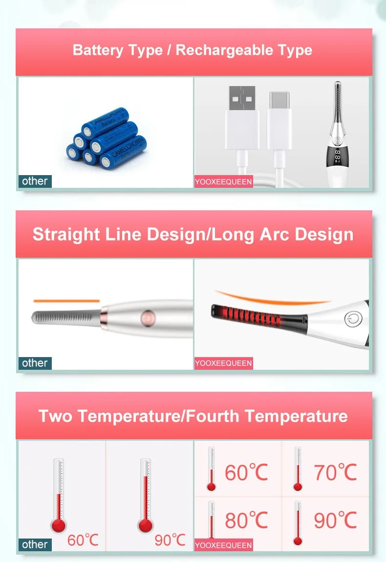 - Feature: Electric Heated Eyelash , USB Rechargeable Eyelash Curler