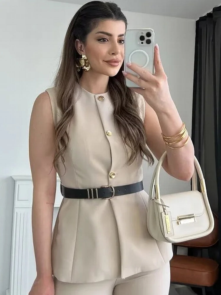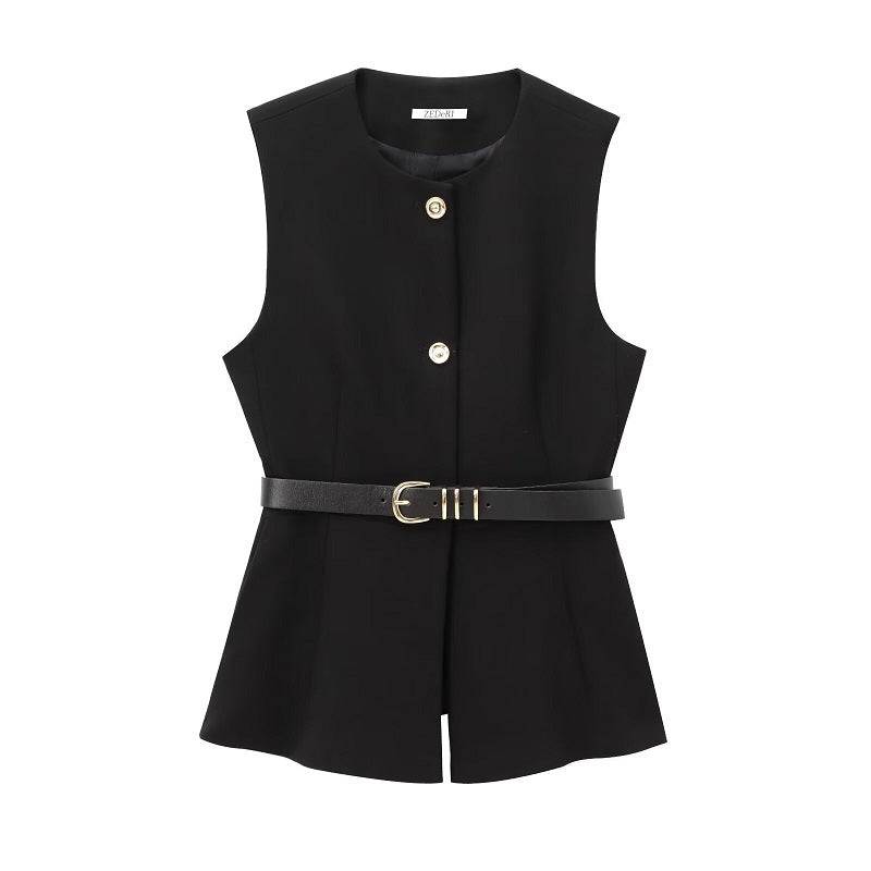 Belt Sleeveless Vest Woman Waistcoat Button Blouse Top