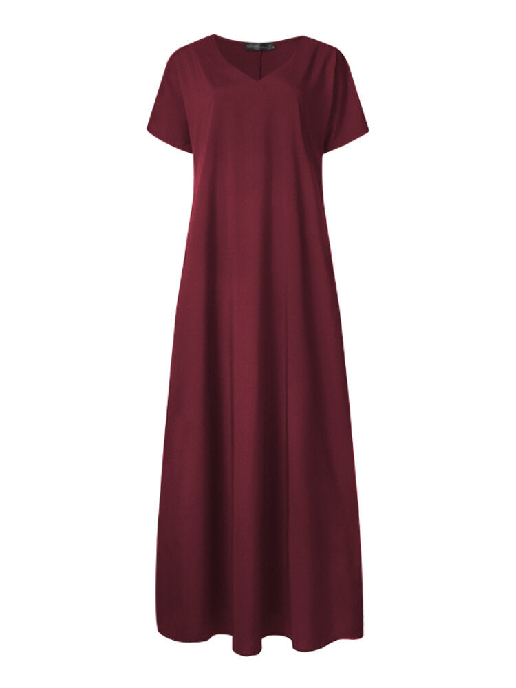 Brief Style Pure Color V-neck Short Sleeve Elegant Pockets Women Maxi Dress