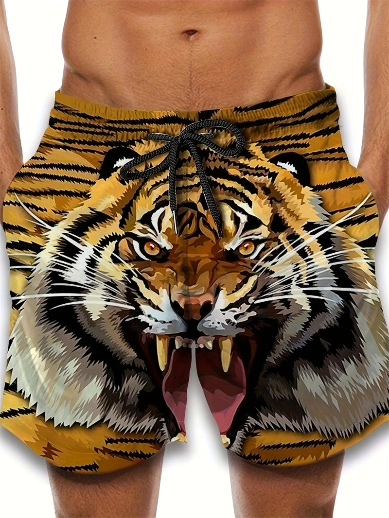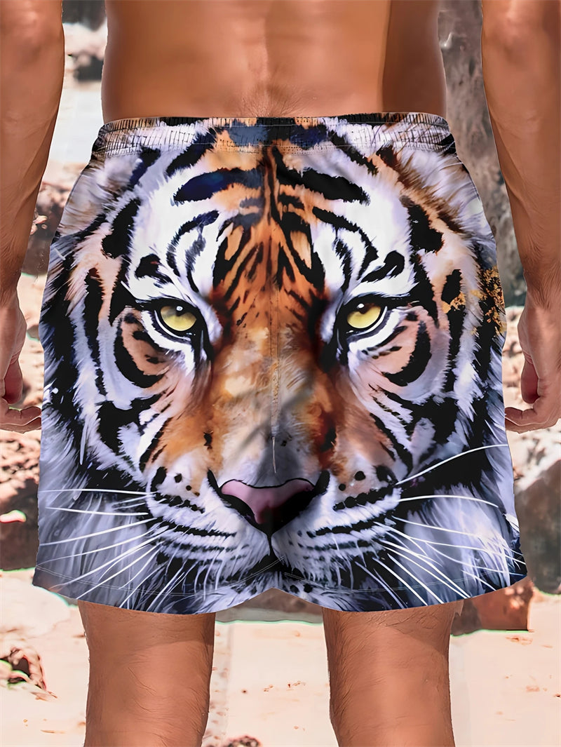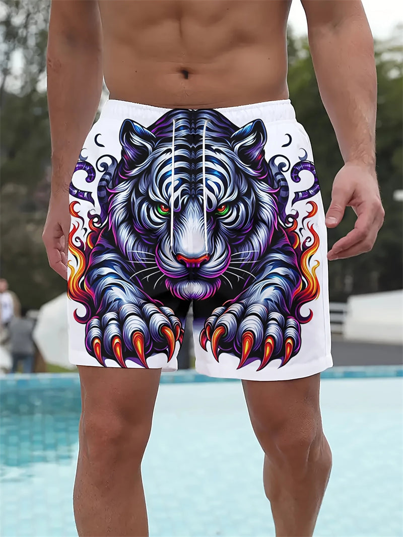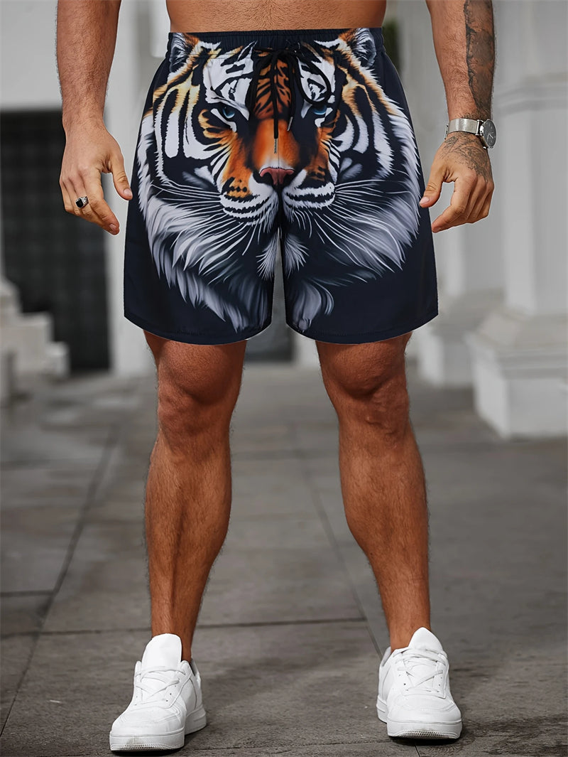These men's beach shorts are designed for summer fashion and active lifestyles. Made with quick-drying material, they feature a bold tiger graphic in 3D print, ensuring both style and comfort. The breathable fabric makes them ideal for casual swimming or sports activities.