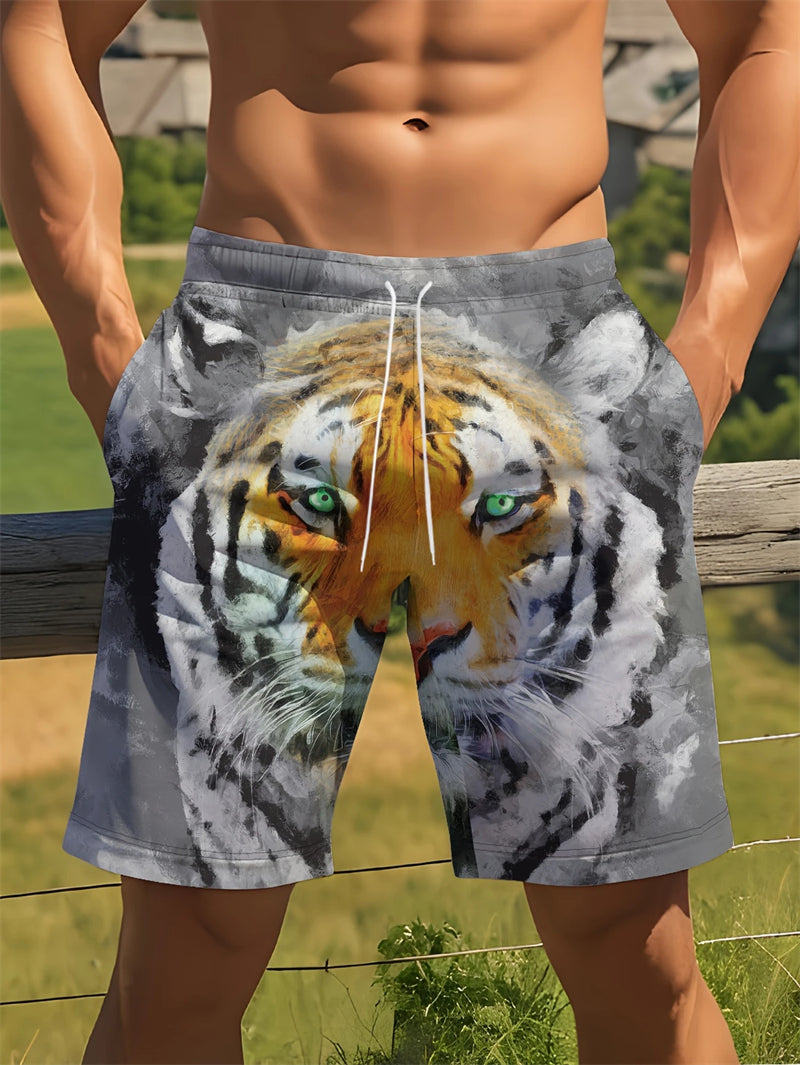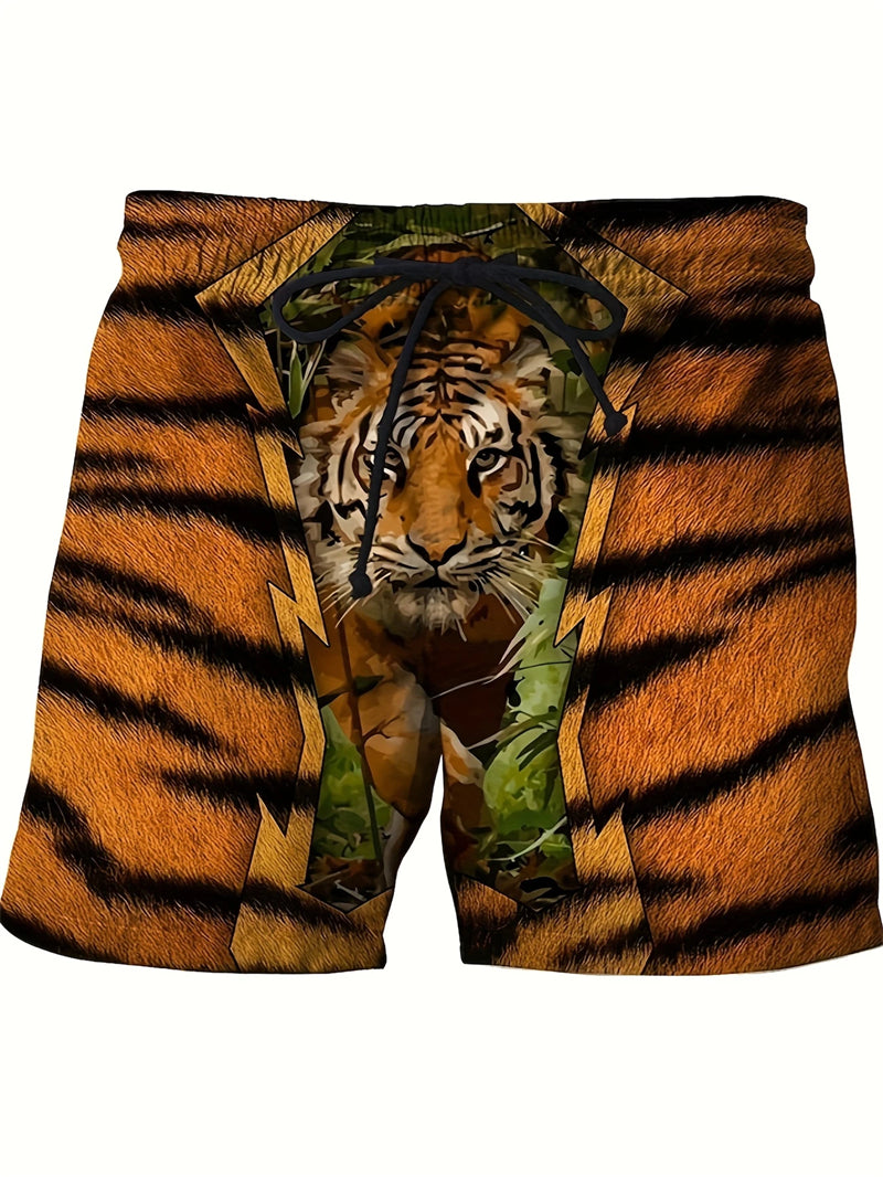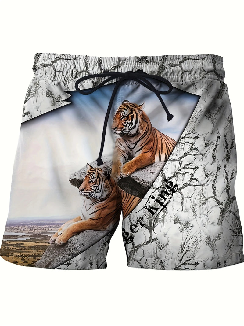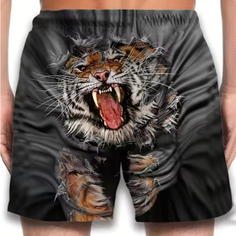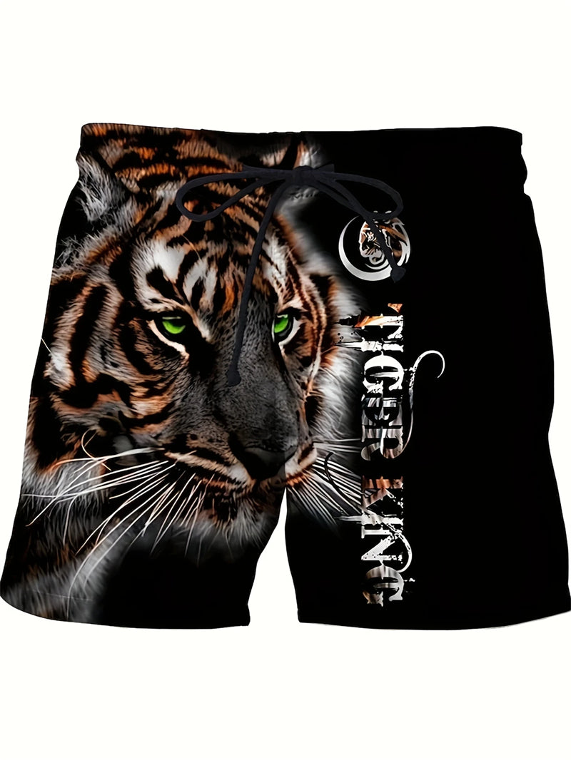 These men's beach shorts are designed for summer fashion and active lifestyles. Made with quick-drying material, they feature a bold tiger graphic in 3D print, ensuring both style and comfort. The breathable fabric makes them ideal for casual swimming or sports activities.