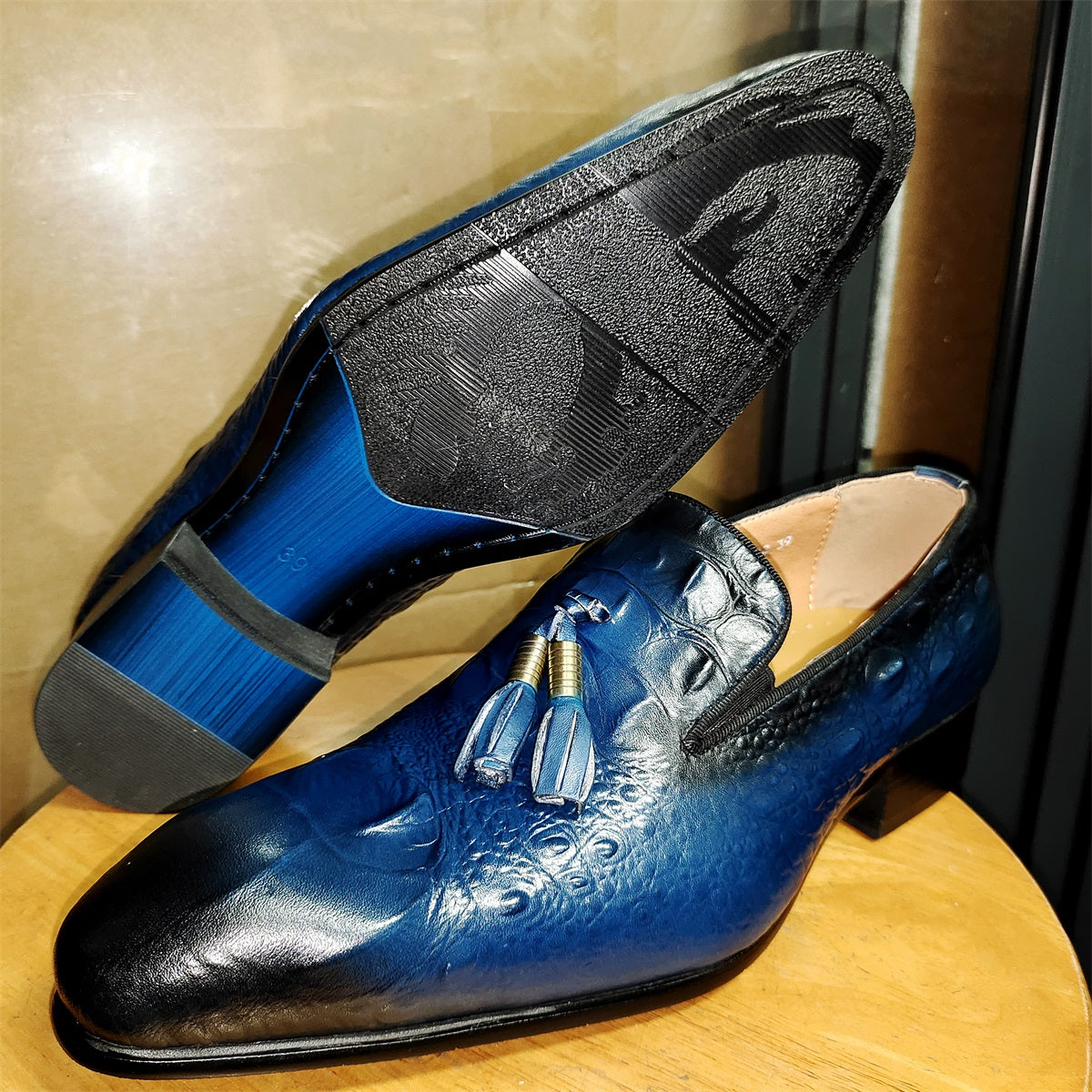 Black tassel loafers are crafted from genuine leather, timeless dress shoes that blend comfort and style seamlessly.
