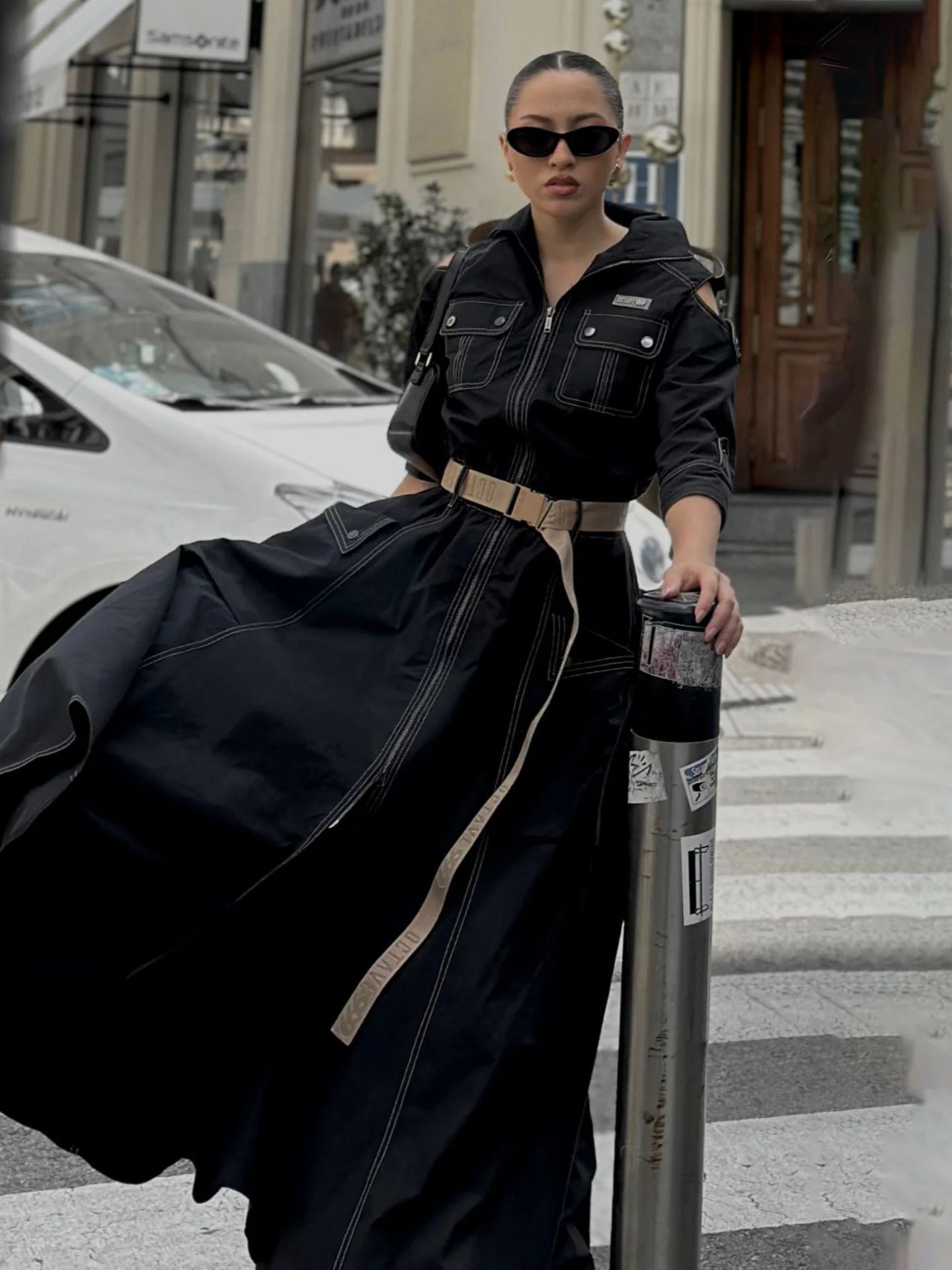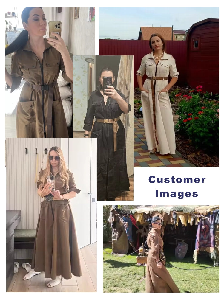 This elegant spring maxi dress features a retro turn-down collar and a stylish cold shoulder design. With half sleeves, a convenient zipper, and a flattering belt, it accentuates the high waistline beautifully. The dress also includes practical pockets and a chic split for added flair, making it a perfect choice for women looking for both comfort and sophistication.