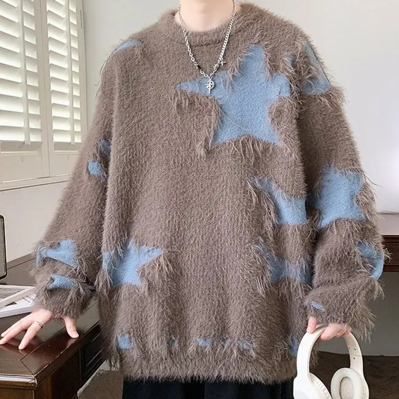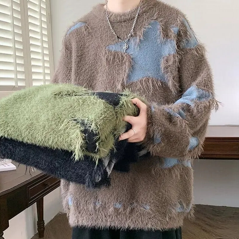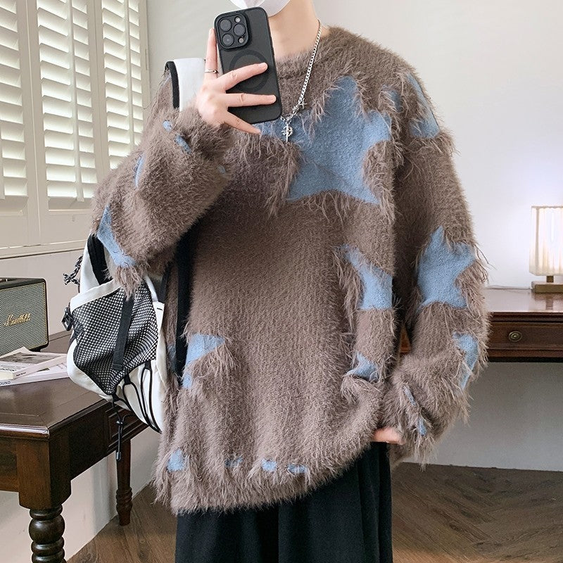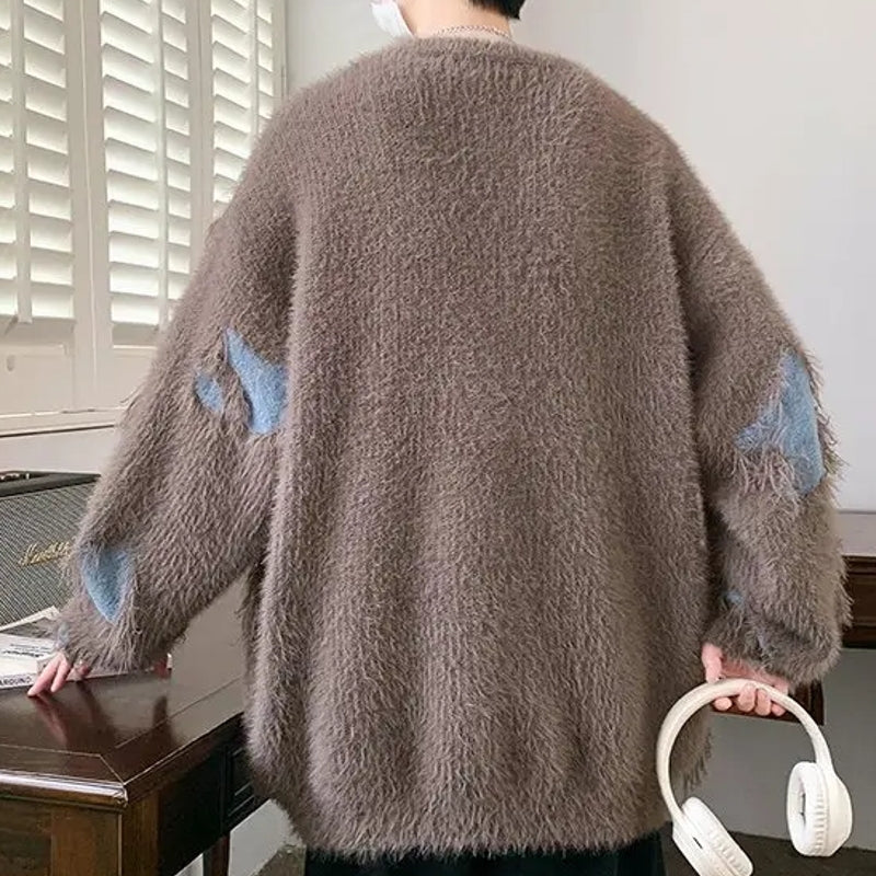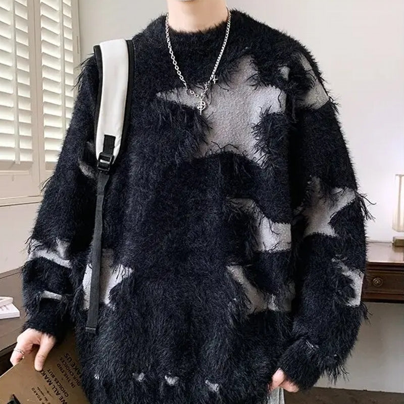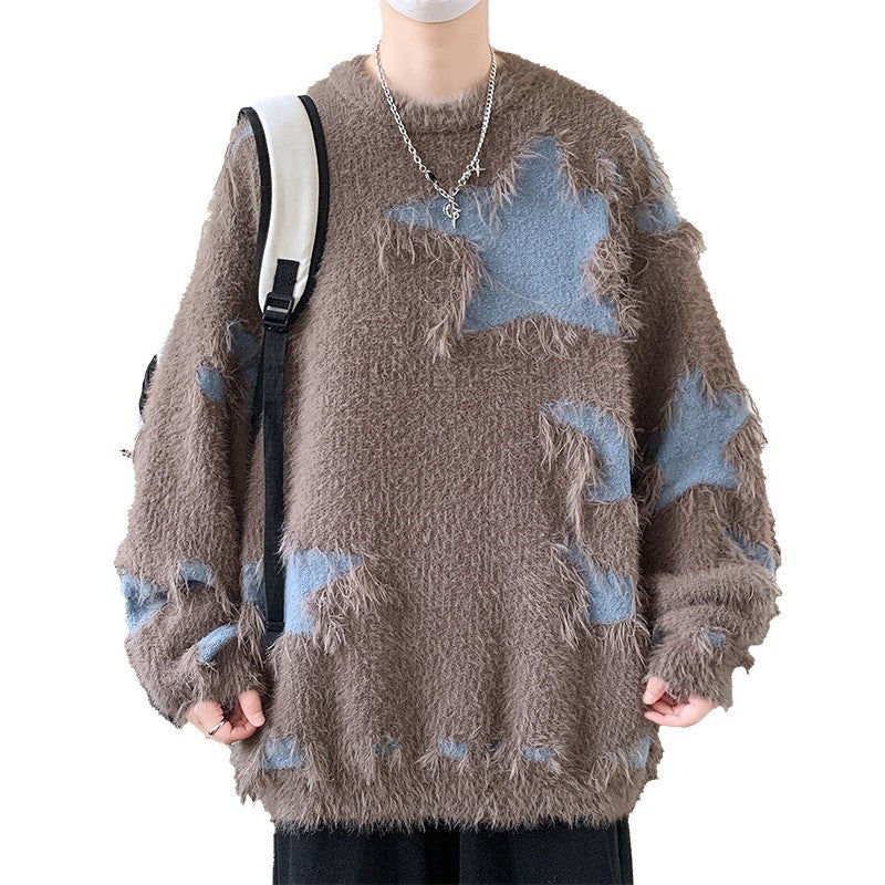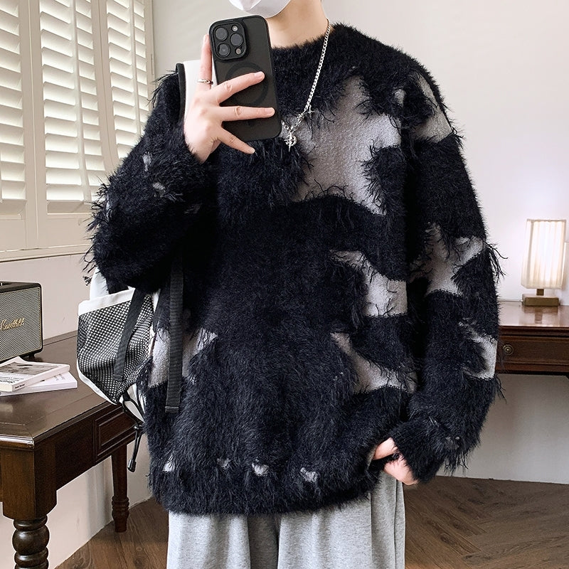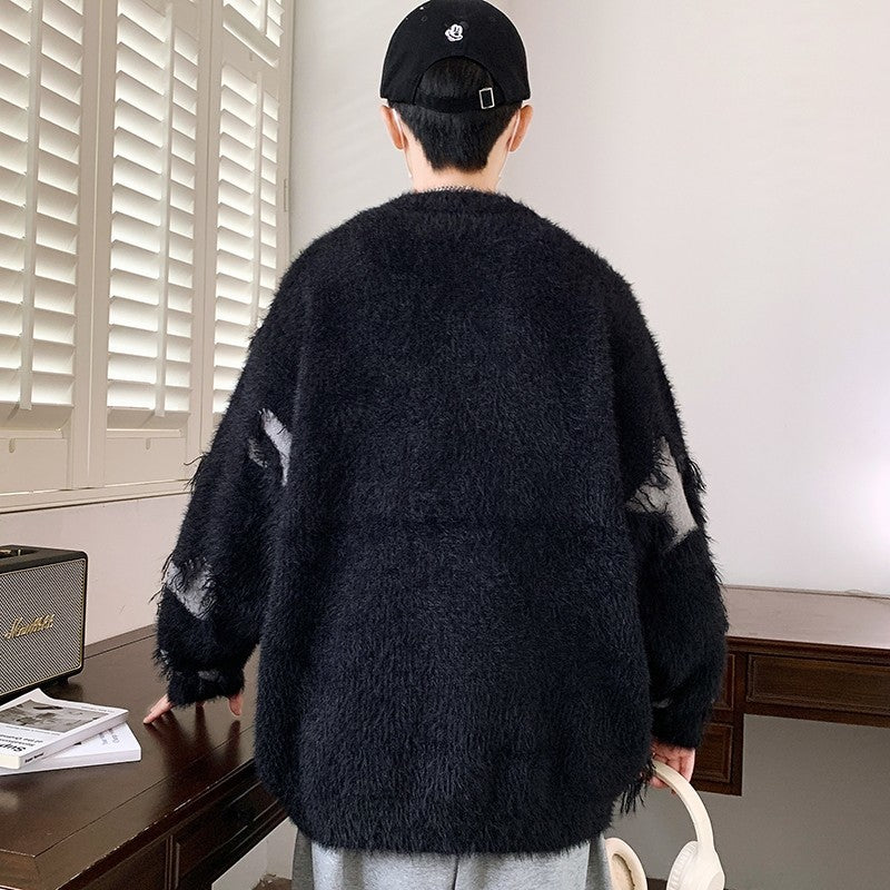 Ripped Sweater Men Loose Crew Neck Knit Bottom Shirt