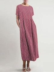Polka Dot Print O-neck Short Sleeve Casual Women Maxi Dress