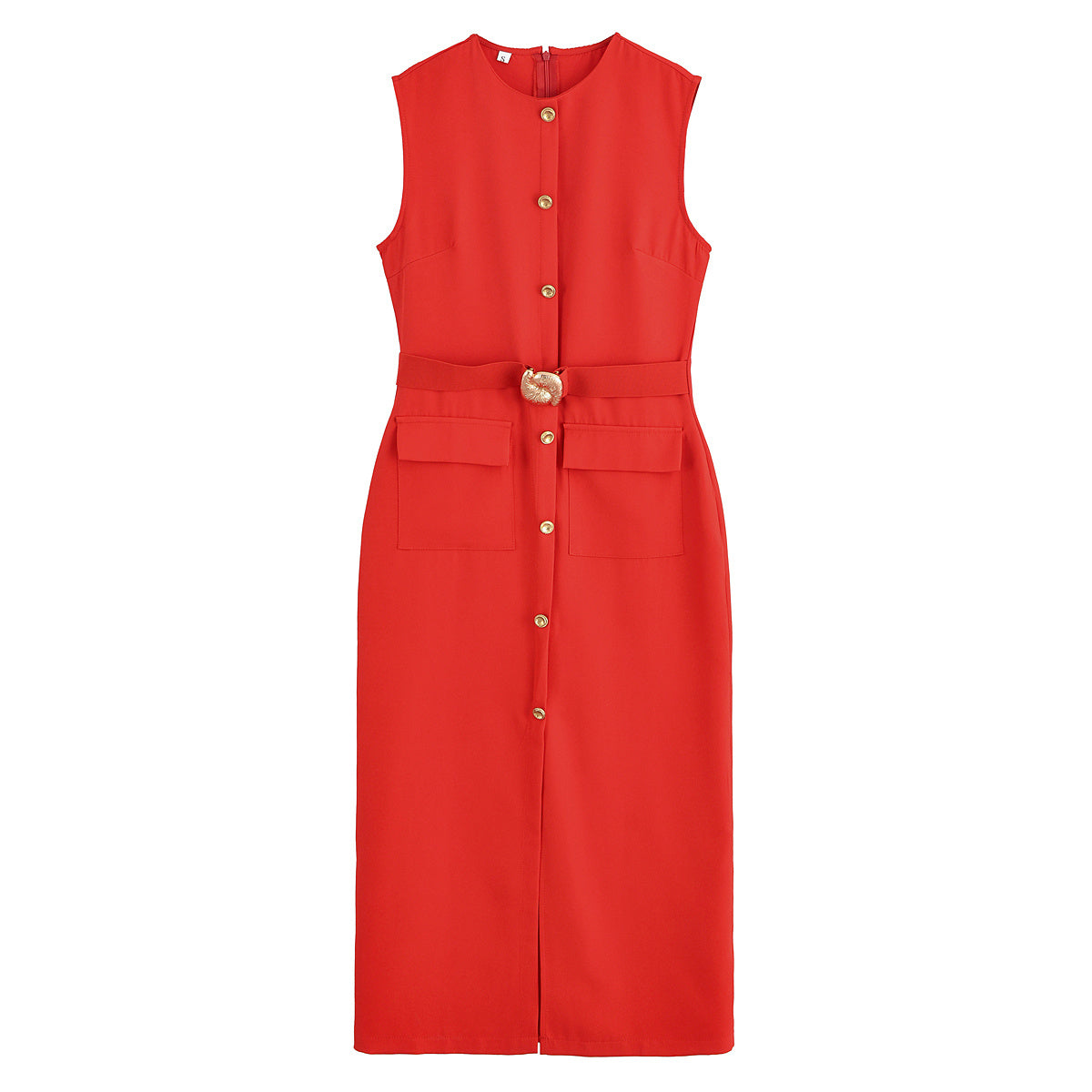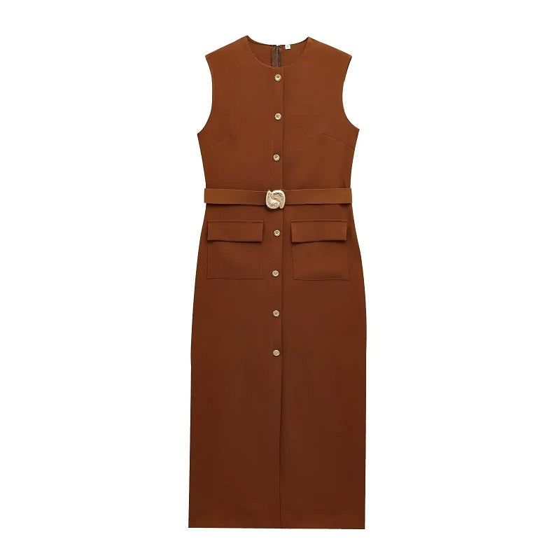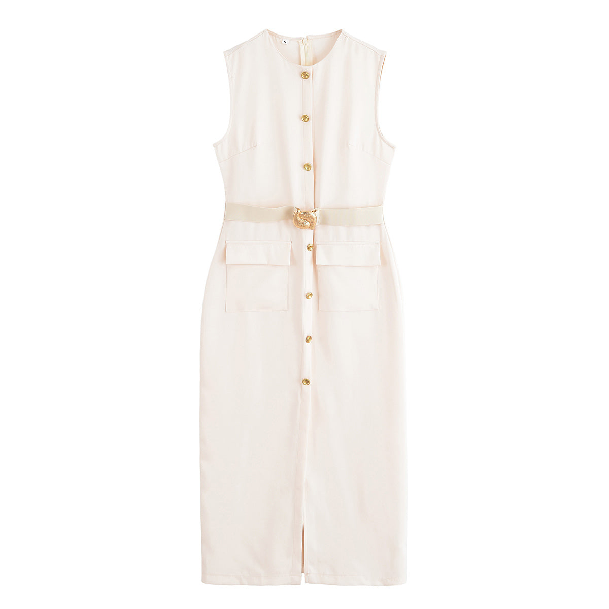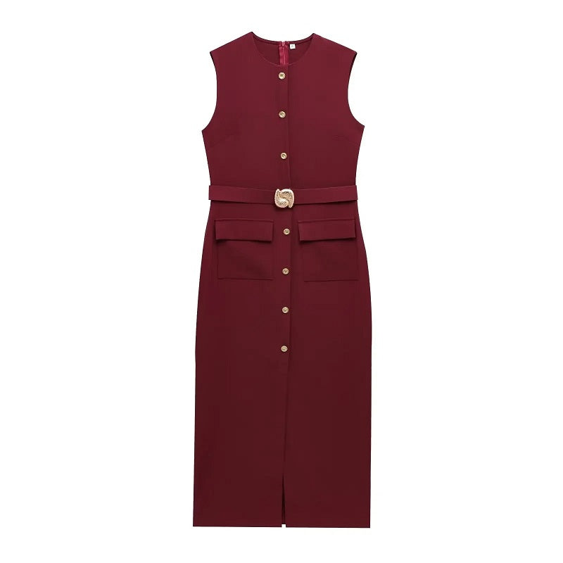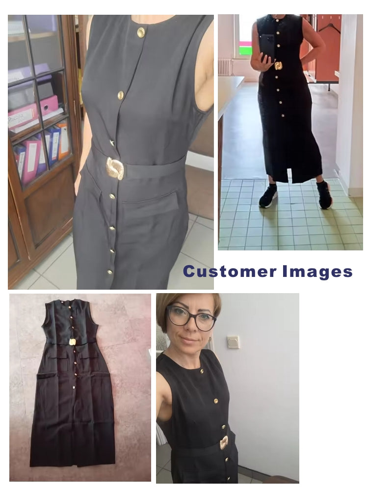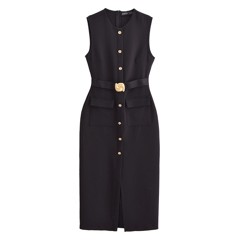 Discover the perfect black office dress for women this spring. Featuring a sleeveless midi design, a stylish belt, and elegant button details, this versatile dress is ideal for professional settings or casual outings. Enhance your wardrobe with this timeless and sophisticated piece.