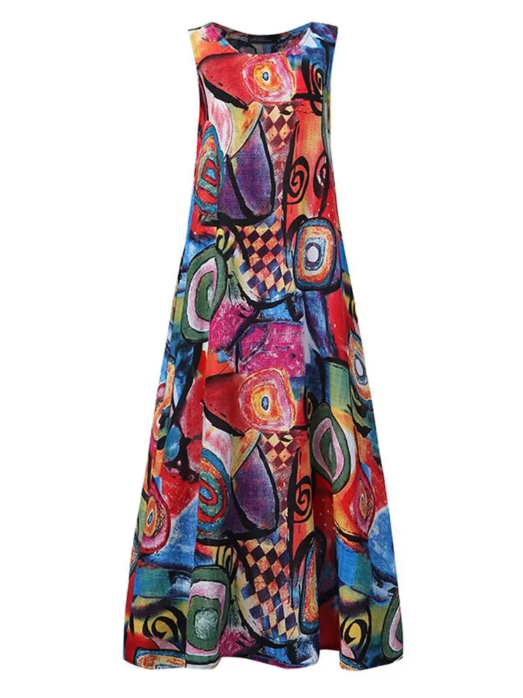 Women Retro O-neck Floral Print Sleeveless Maxi Dress