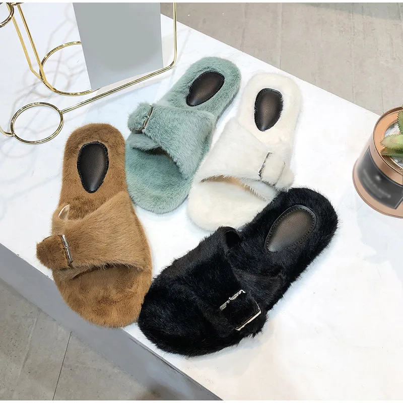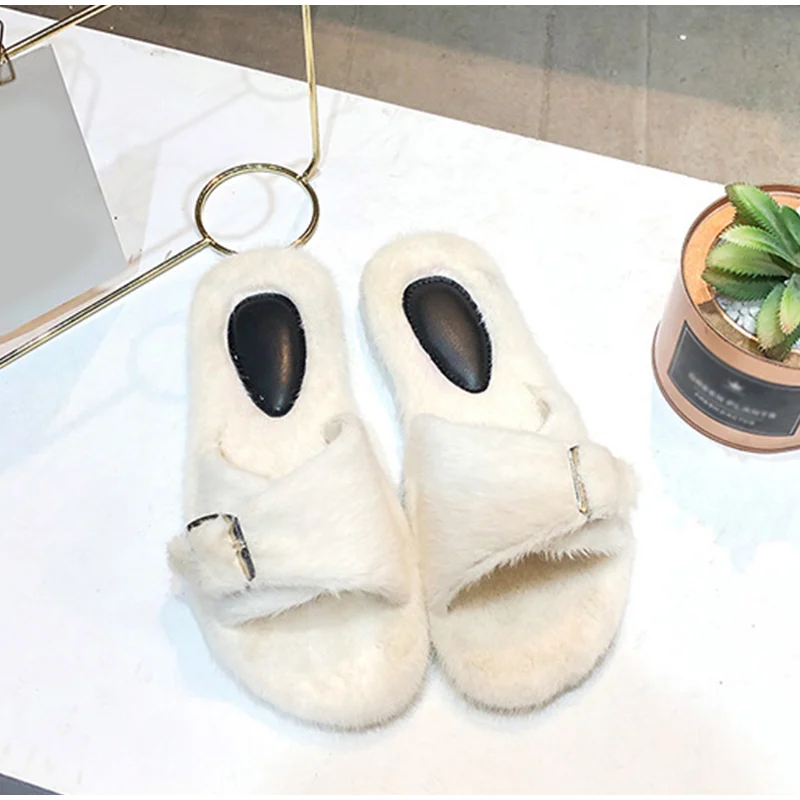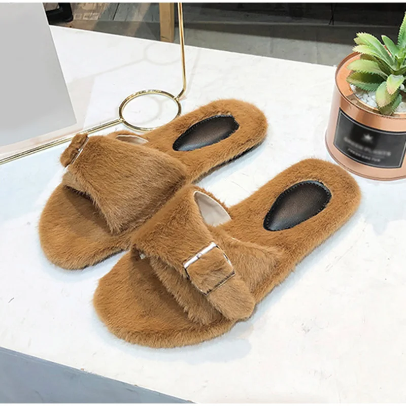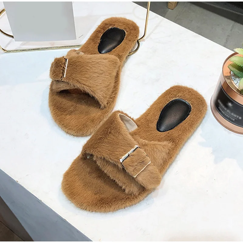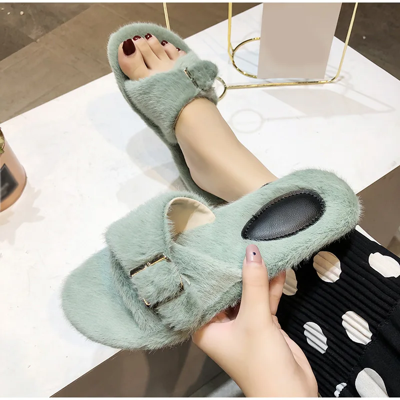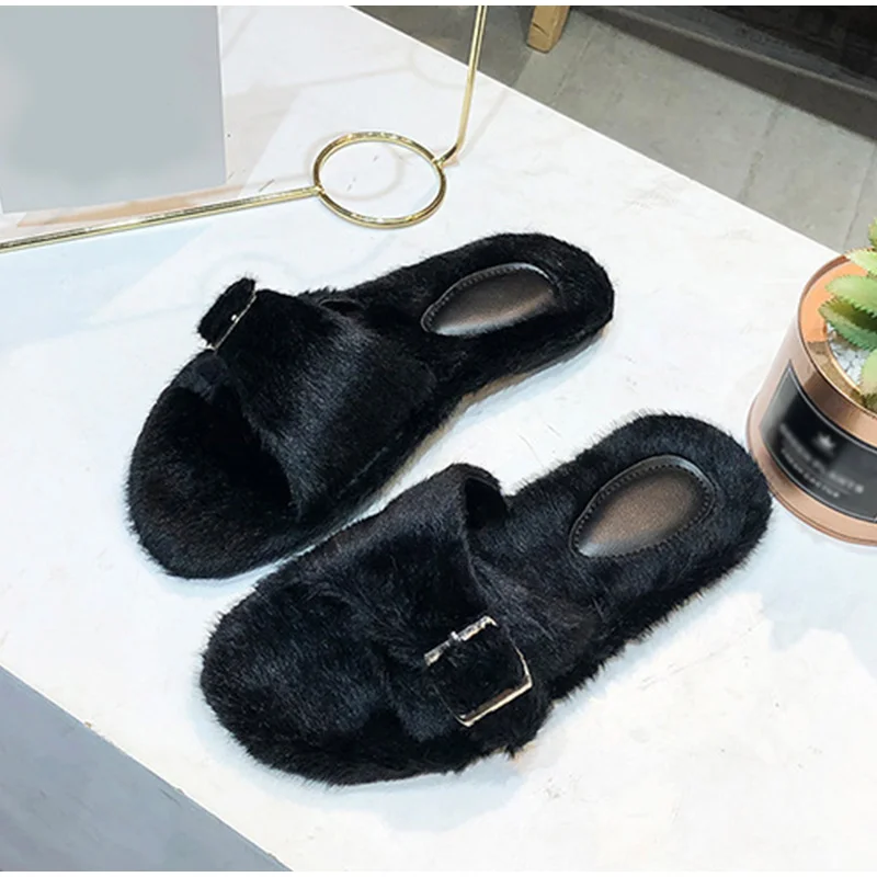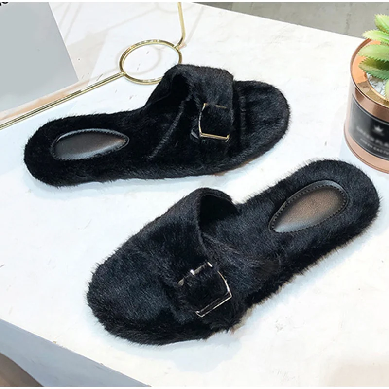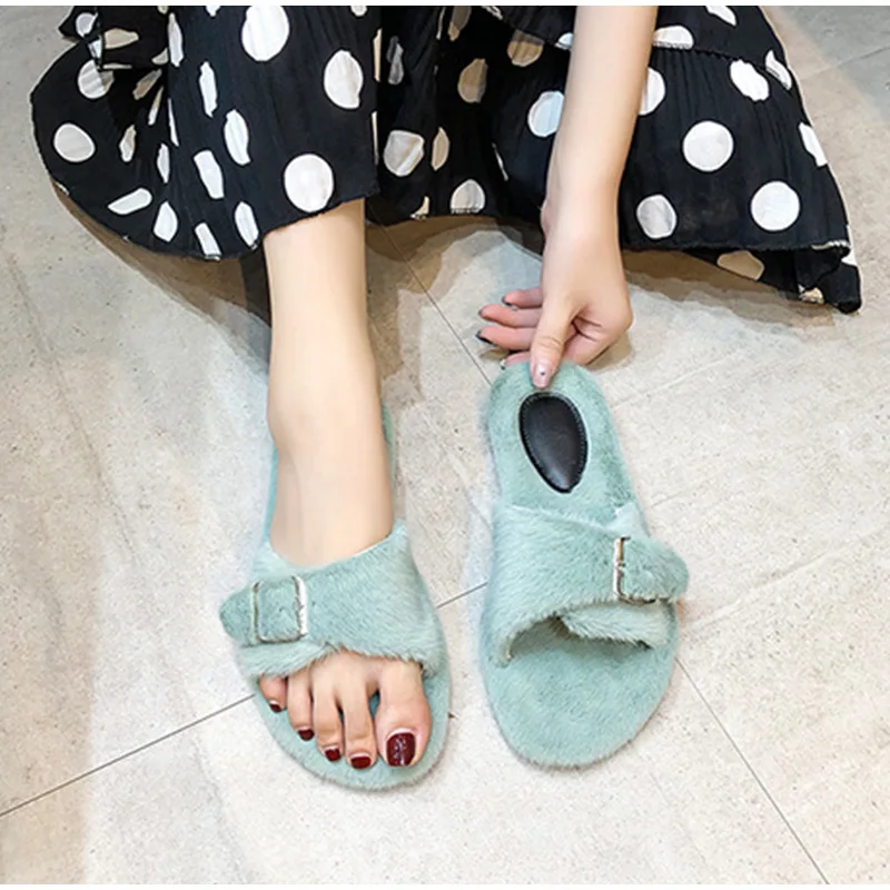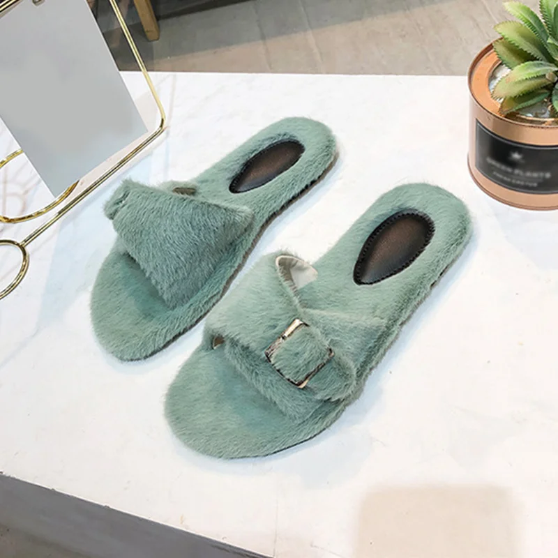 Woman Buckle Flat Female Fur Indoor Outdoor Elegant Slippers