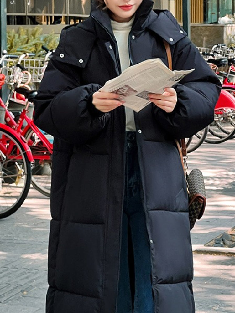 This is a stylish and cozy winter cotton jacket designed for women. It features a long coat style with a Korean-inspired loose fit, offering both comfort and fashion. The thick material ensures warmth during cold seasons, while the hooded design adds extra protection against chilly winds. Perfect for staying fashionable and comfortable, this jacket is ideal for casual outings or everyday wear.