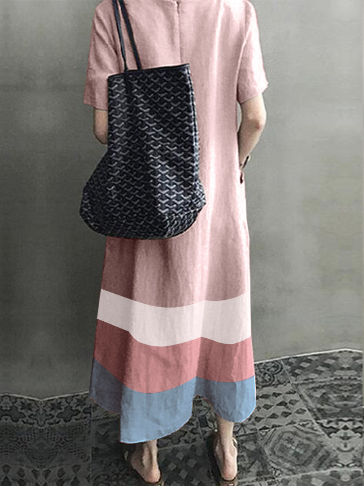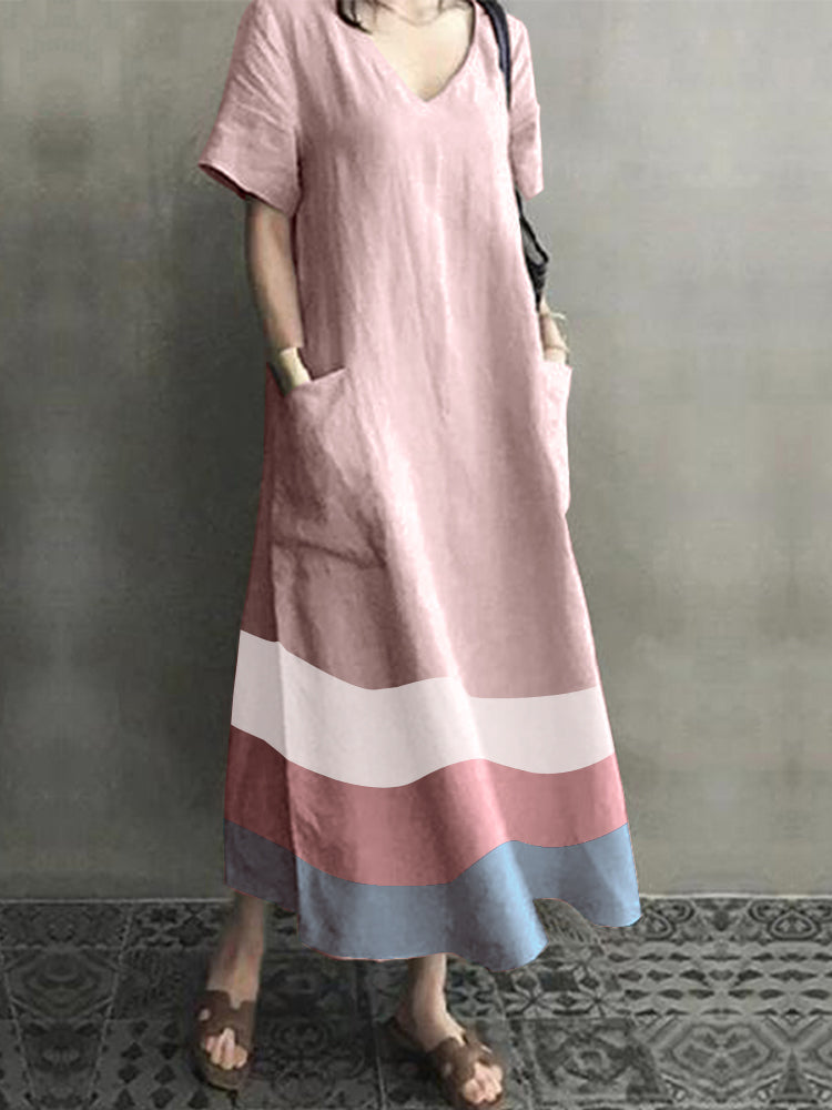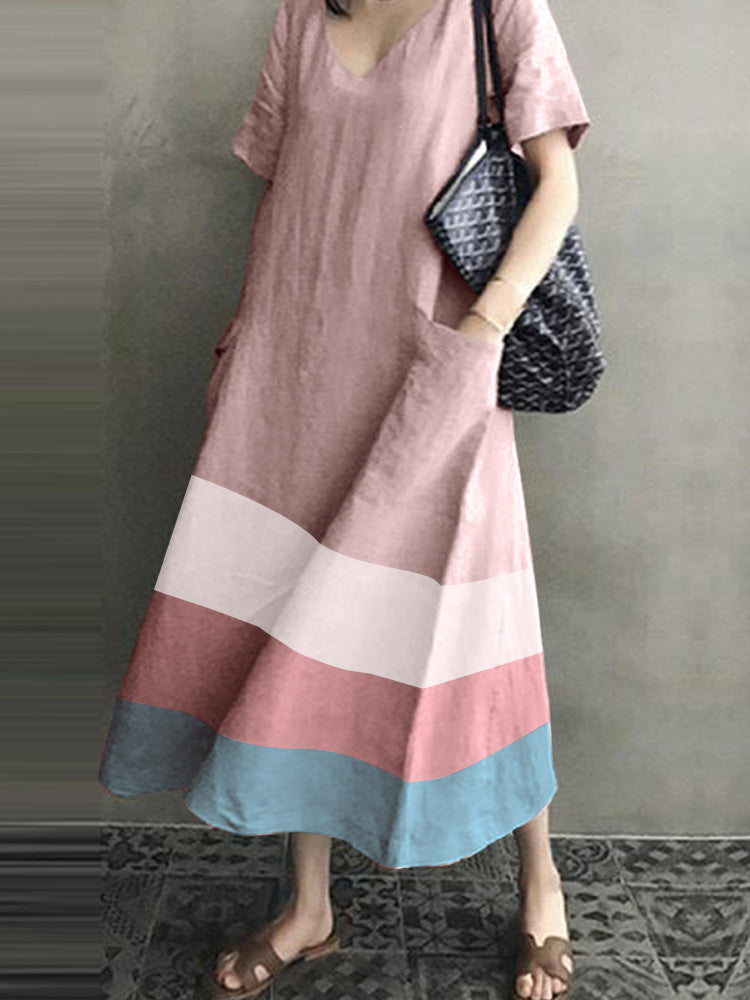 Women Cotton Contrast Color Stripe Print V-neck Side Pocket Maxi Dress