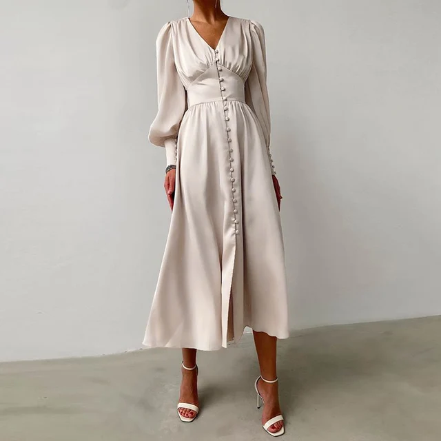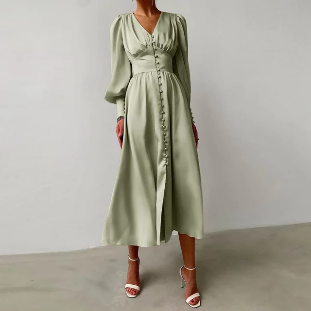Satin Button Up V-neck Long Sleeve Elegant Women Maxi Dress