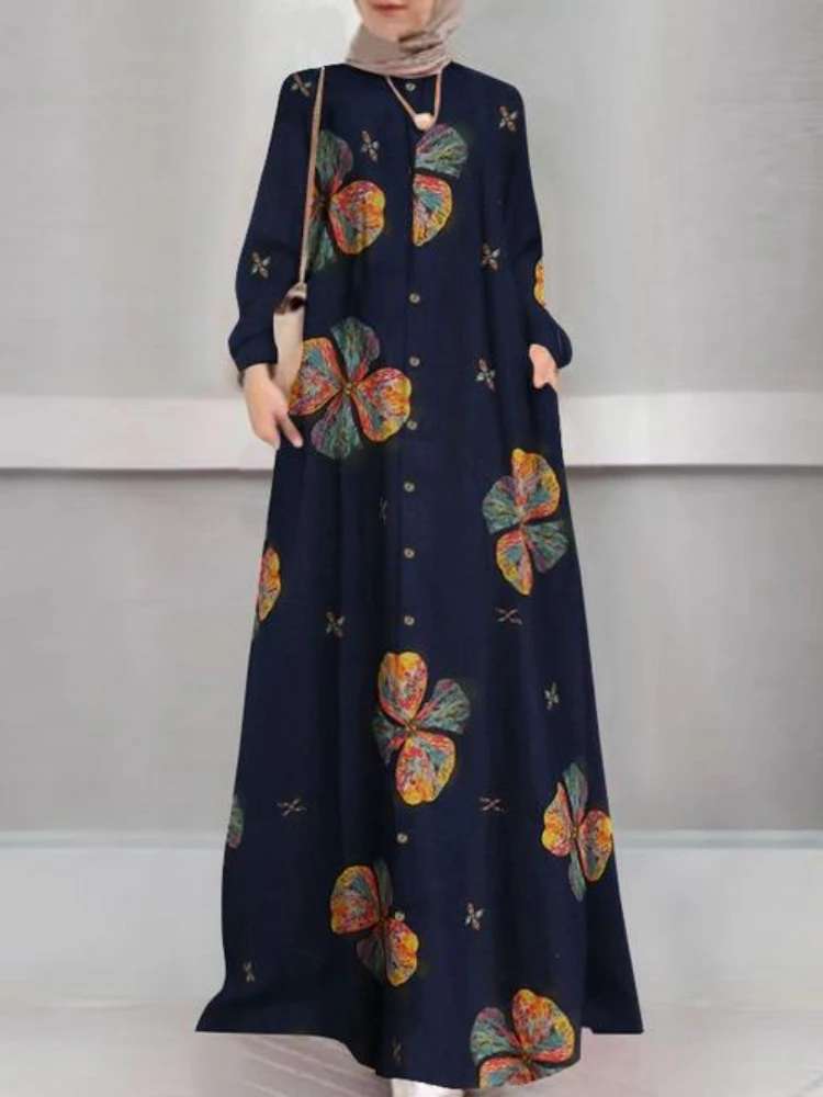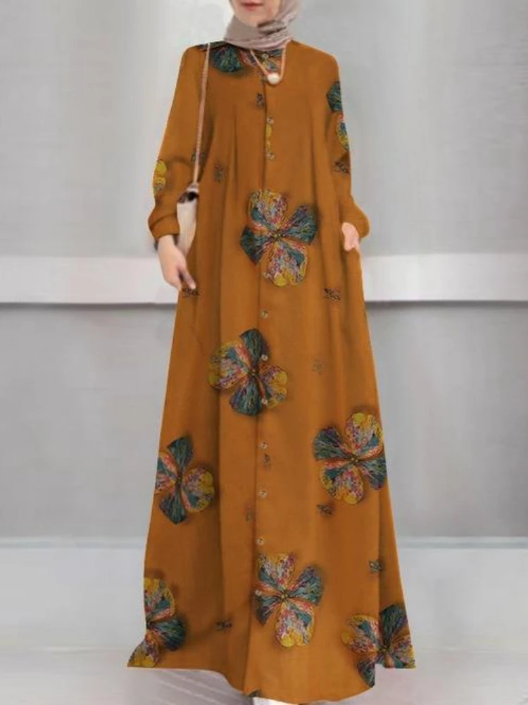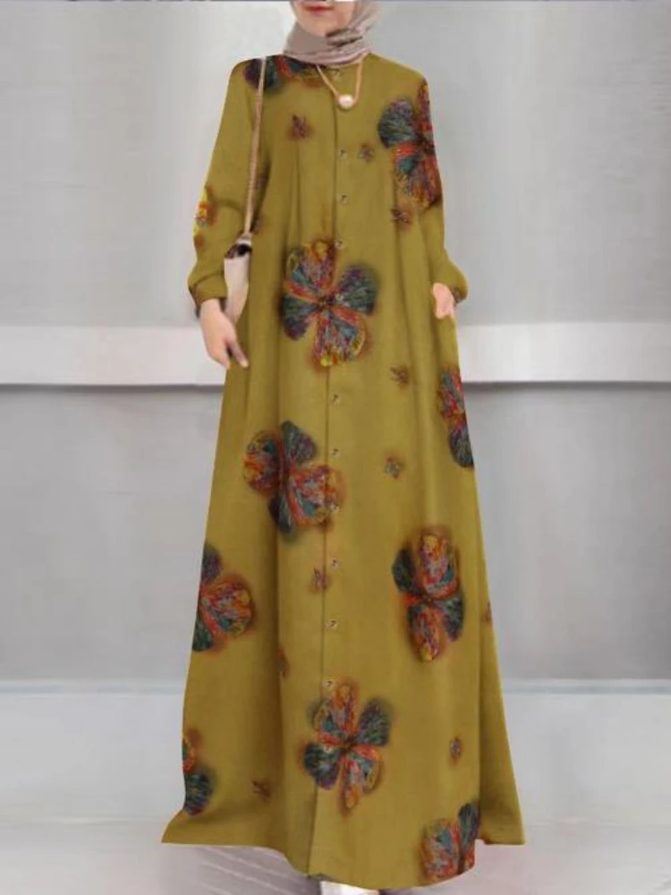 Women Floral Print Holiday A-Line Button Up Long Sleeve Muslim