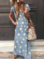 Daisy Print V-neck Short Sleeve Casual Loose Women Maxi Dress