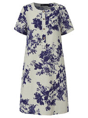 Ethnic Style Floral Print Short Sleeve Half Button Front Vintage Women Midi Dress