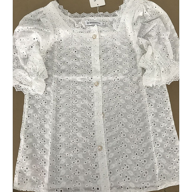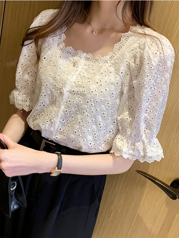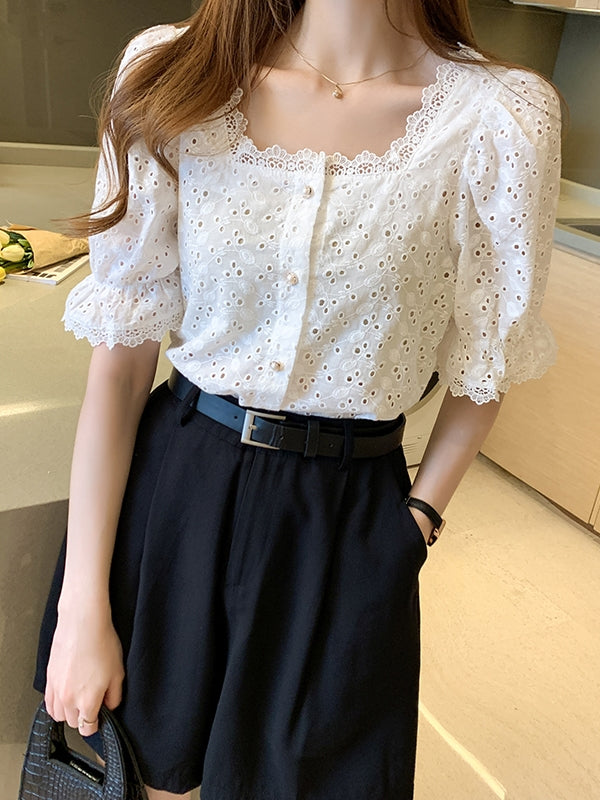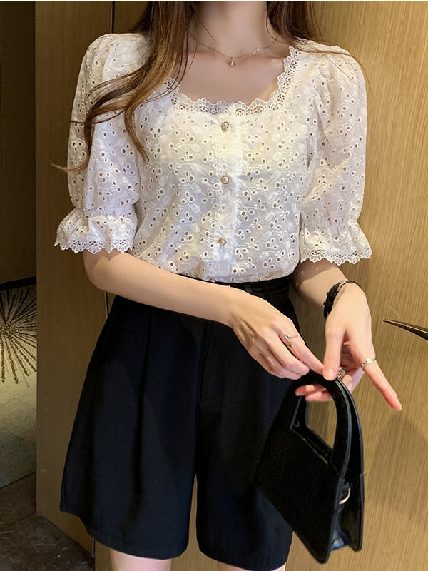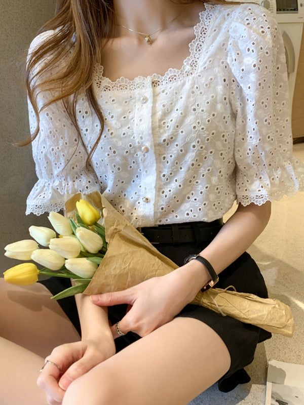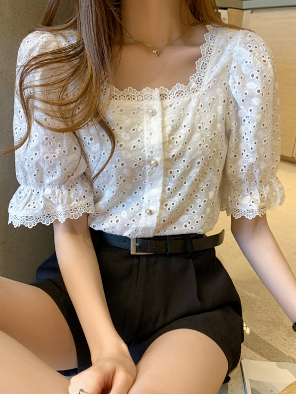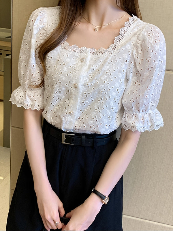 Korean Style Lace Shirt Fashion Elegant Summer Short Sleeve Woman Shirts Square Collar Hollow Out White Blouse Women