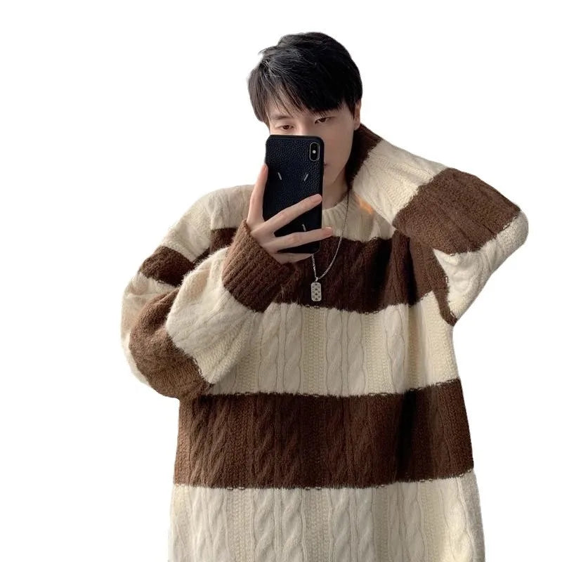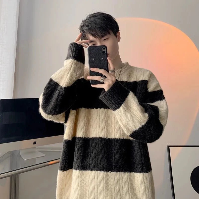 Fashion Knit Sweater O-Neck Patchwork Striped Tops