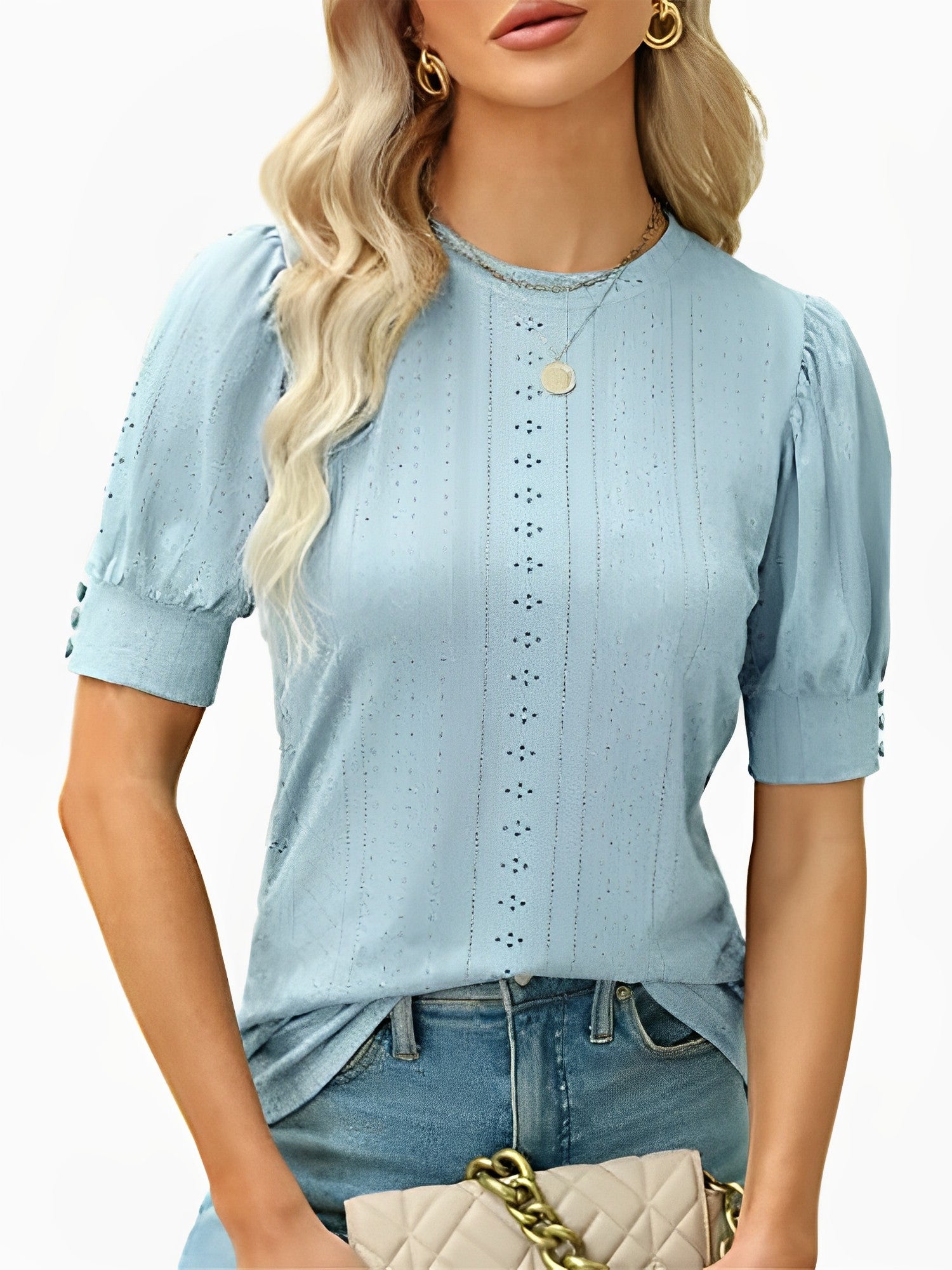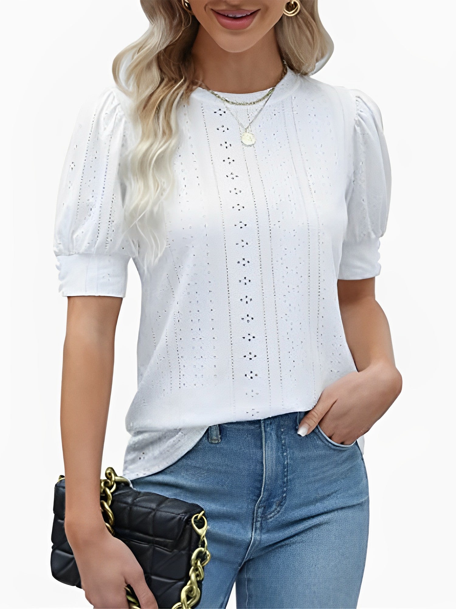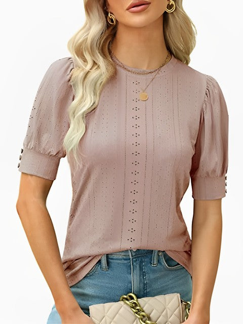 Fashion Hollow Out O Neck Puff Sleeve Office Lady Shirt