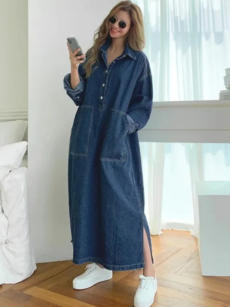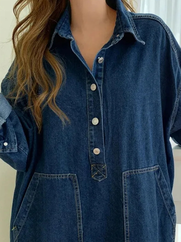 Long Sleeved Denim Shirt Dress Button Pocket Jeans