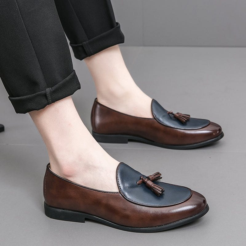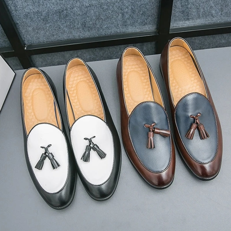 Elegant tassel-adorned formal business shoes for men, inspired by Italian luxury. These mix-color moccasins are perfect for prom, dressy occasions, casual outings, or parties. Stylish and comfortable loafers designed to make a statement.