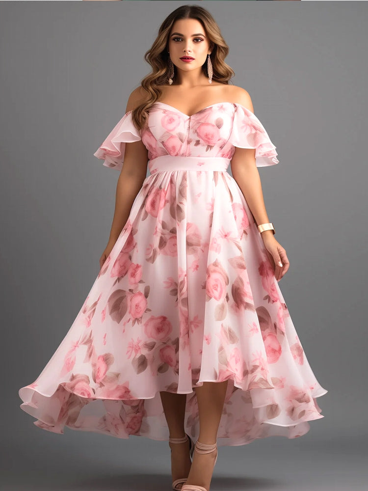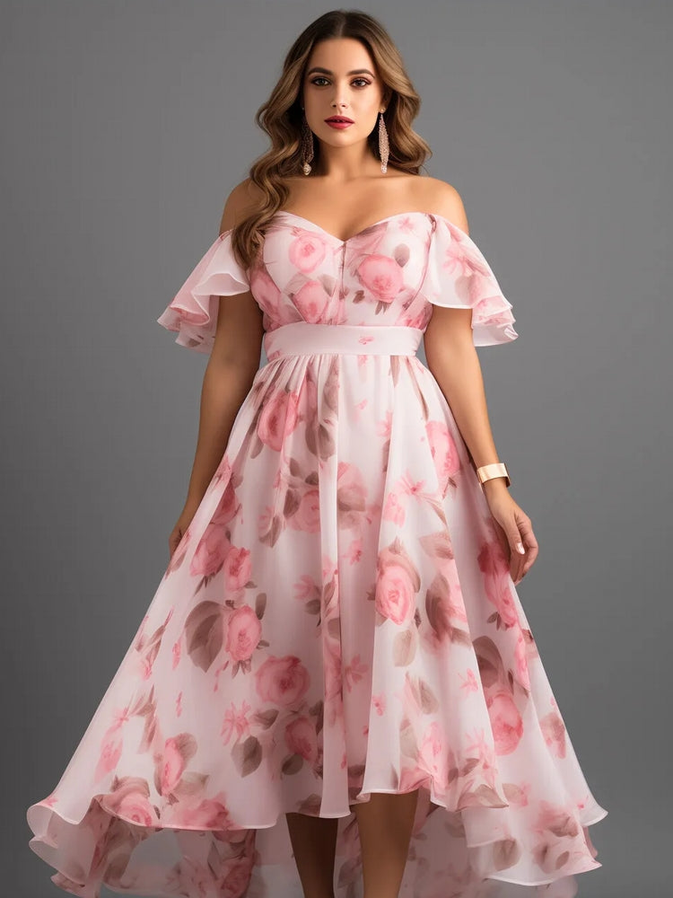 Pink Chiffon Floral Low Hem Maxi Dress 5XL