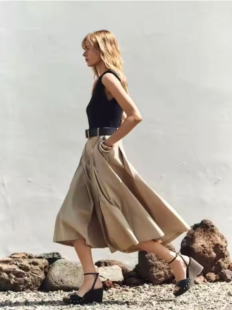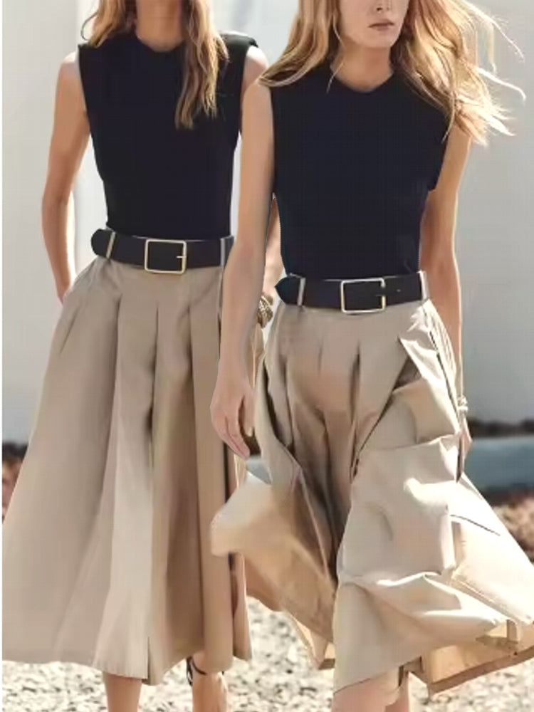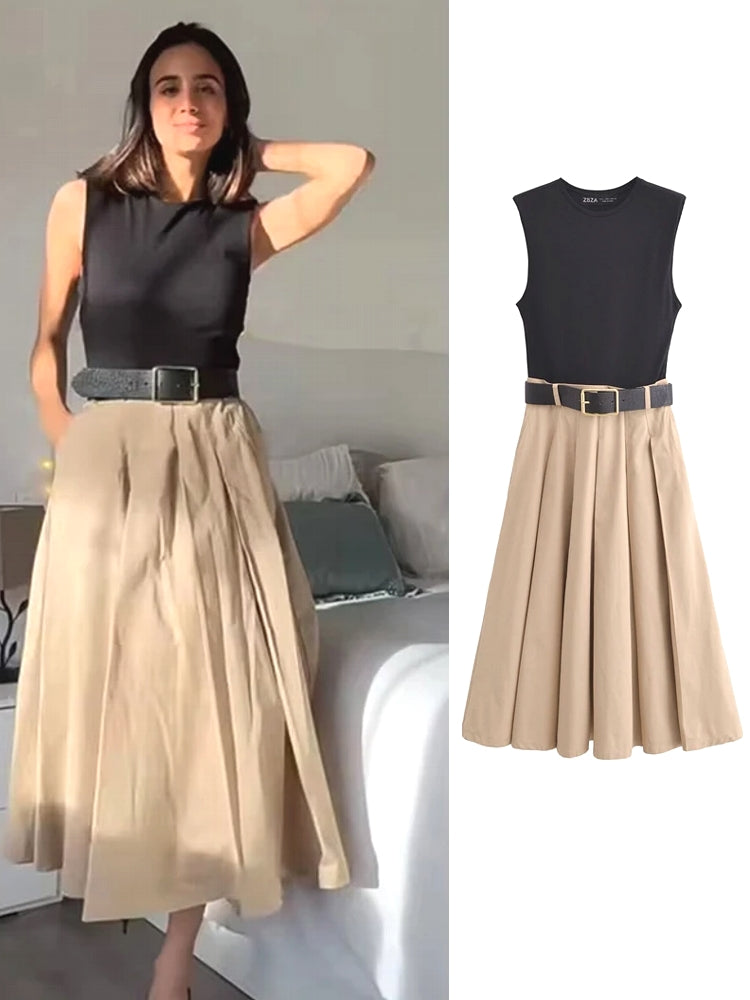Woman Dresses Belt Pleated Sleeveless Midi Dress