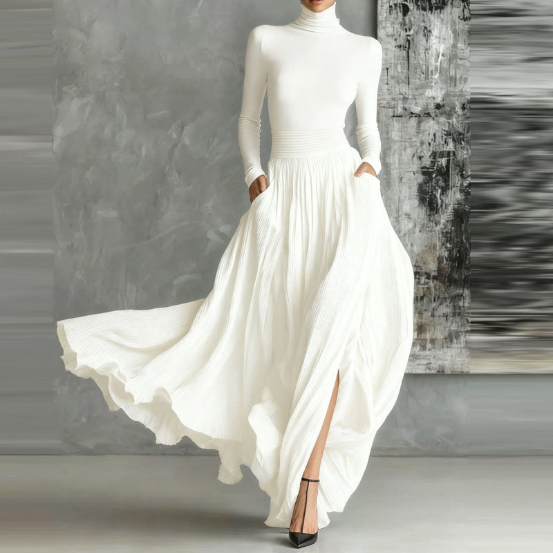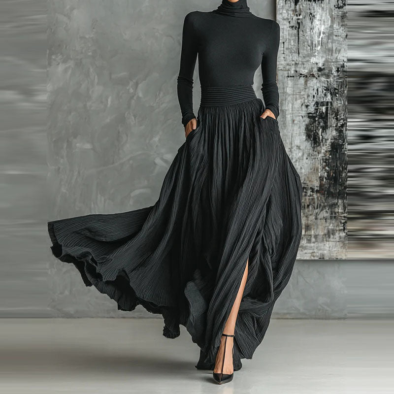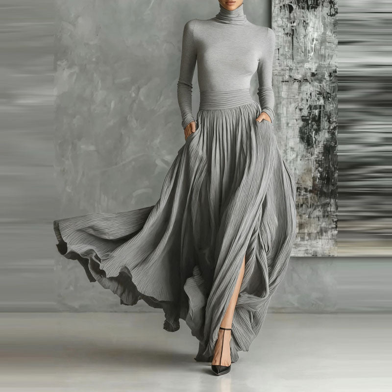Stylish and sophisticated two-piece outfit for women, featuring a turtleneck pullover with long sleeves and a matching long skirt. Designed with a casual yet elegant touch, the set includes practical pockets and showcases a solid color scheme.