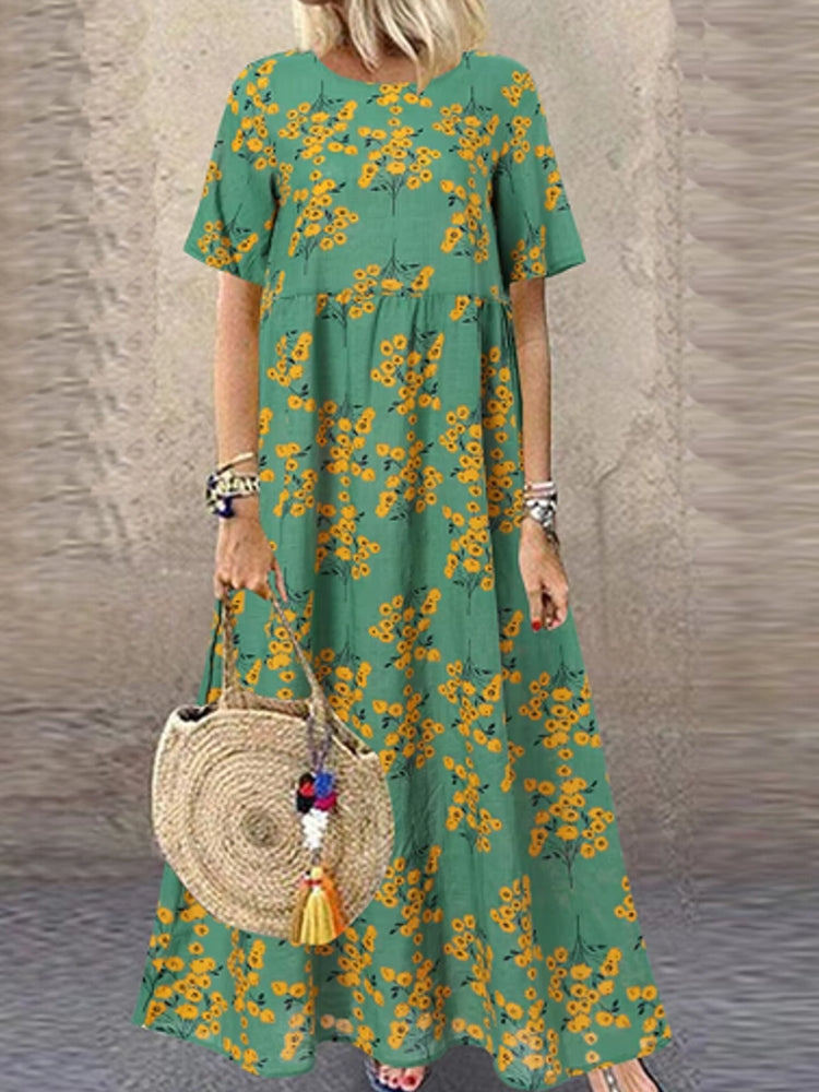 Short Sleeve Floral Print O-neck Sleeve Women Maxi Dress