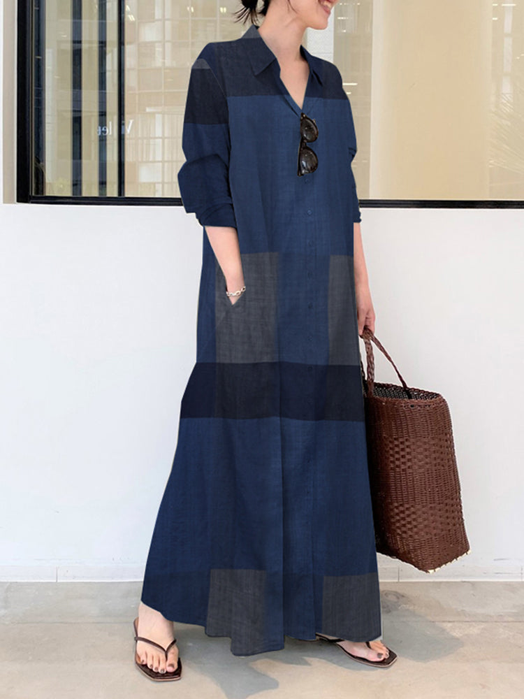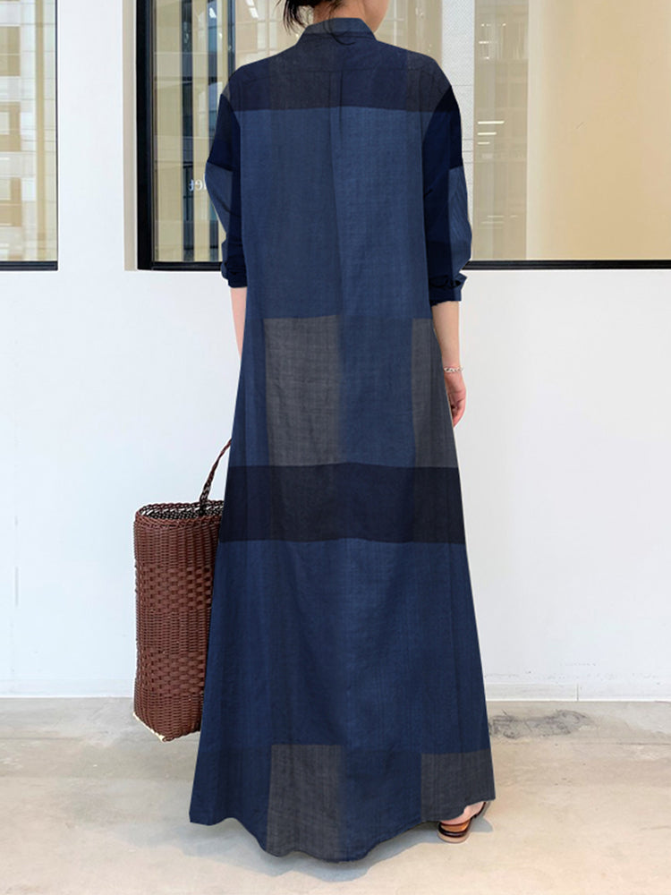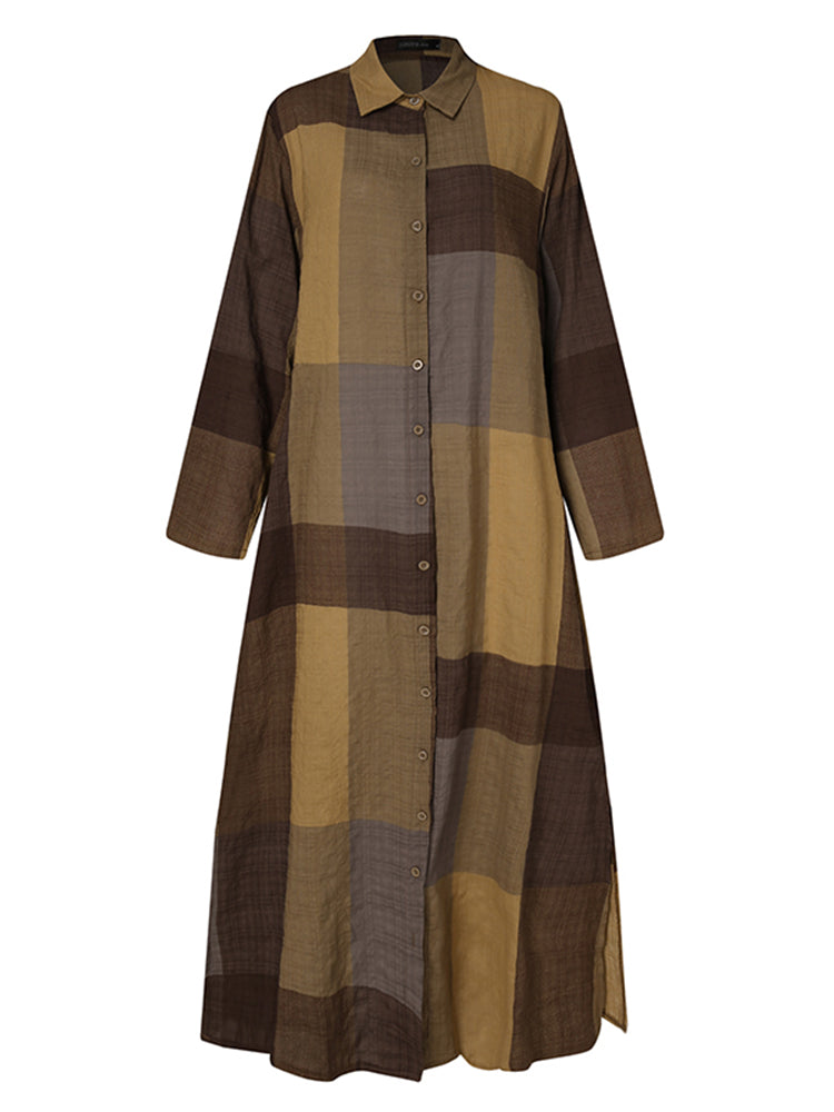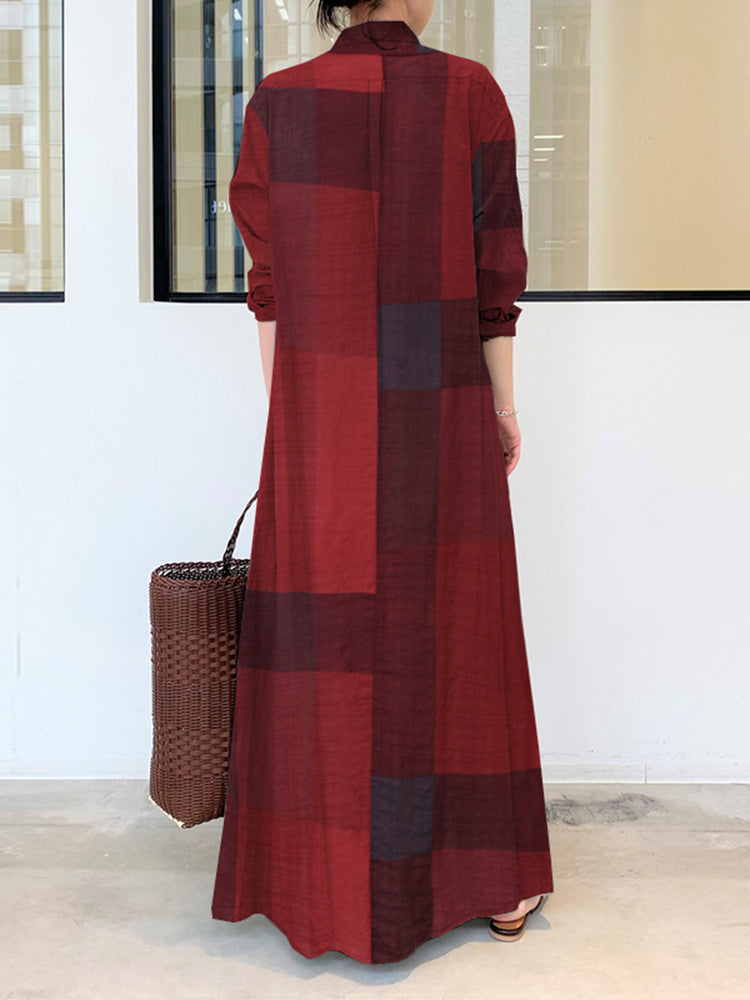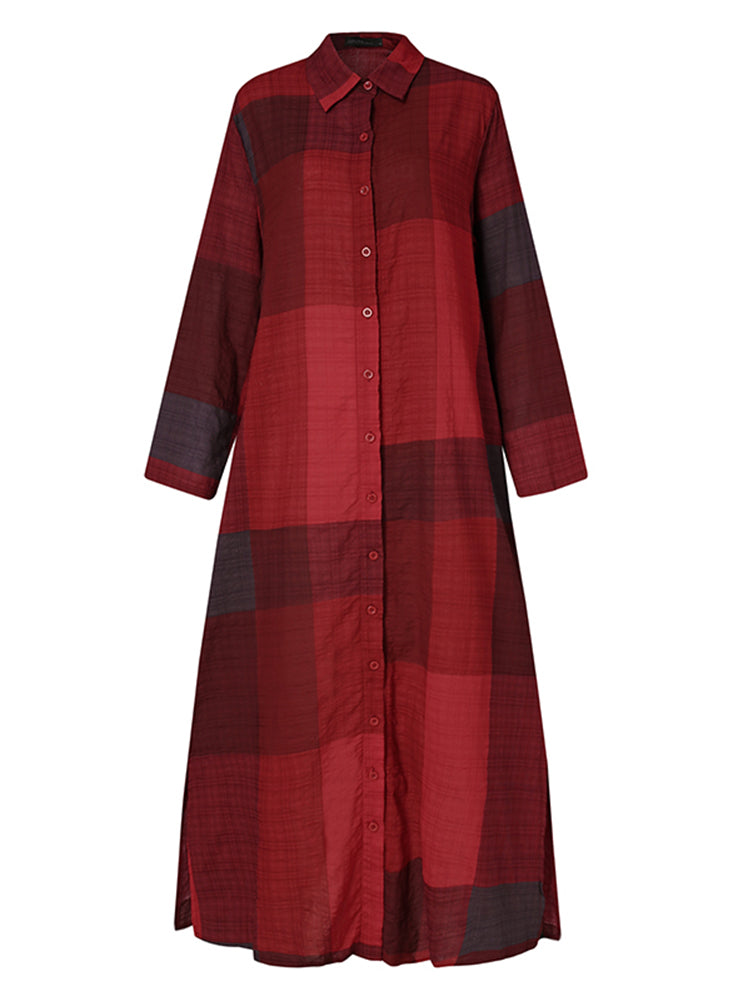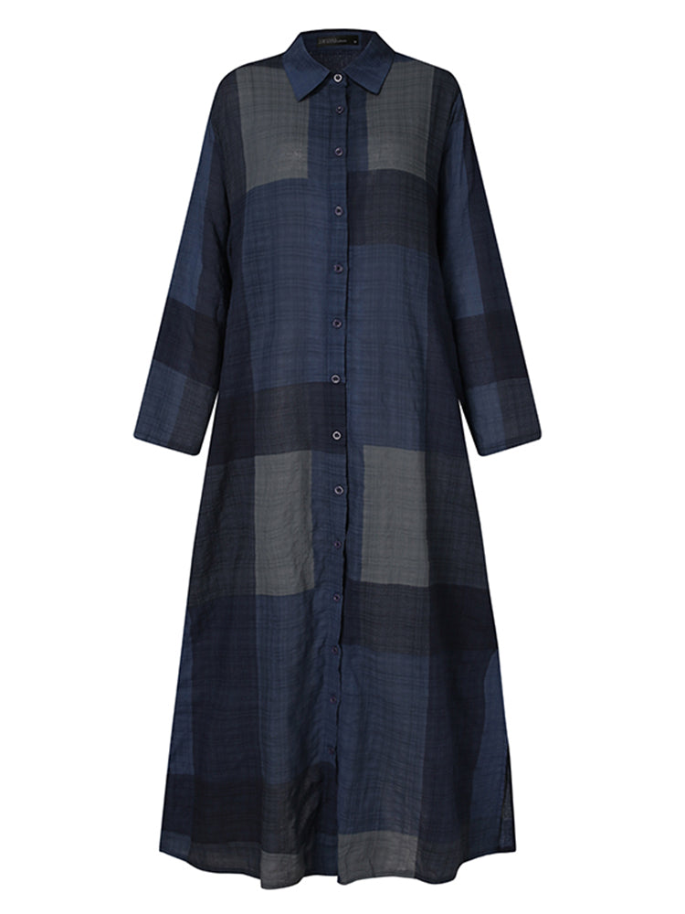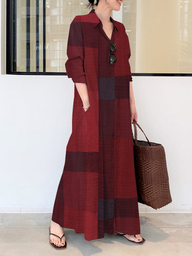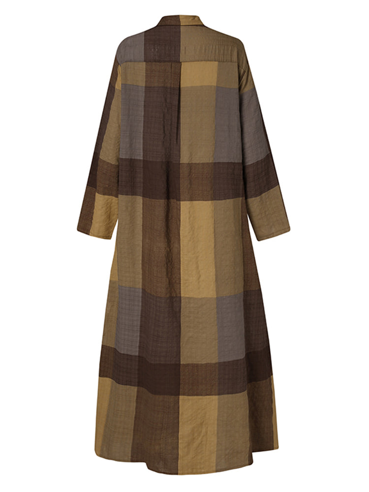 Women Casual Plaid Lapel Long Sleeve Button Vintage Shirt Maxi Dresses With Pocket