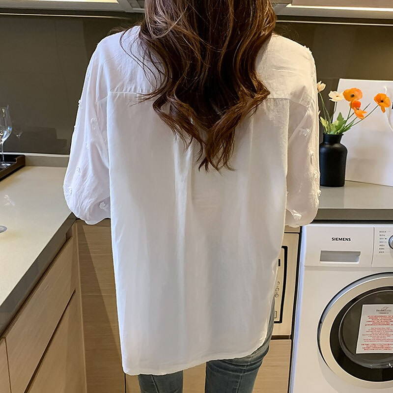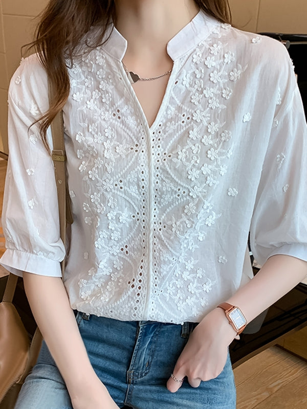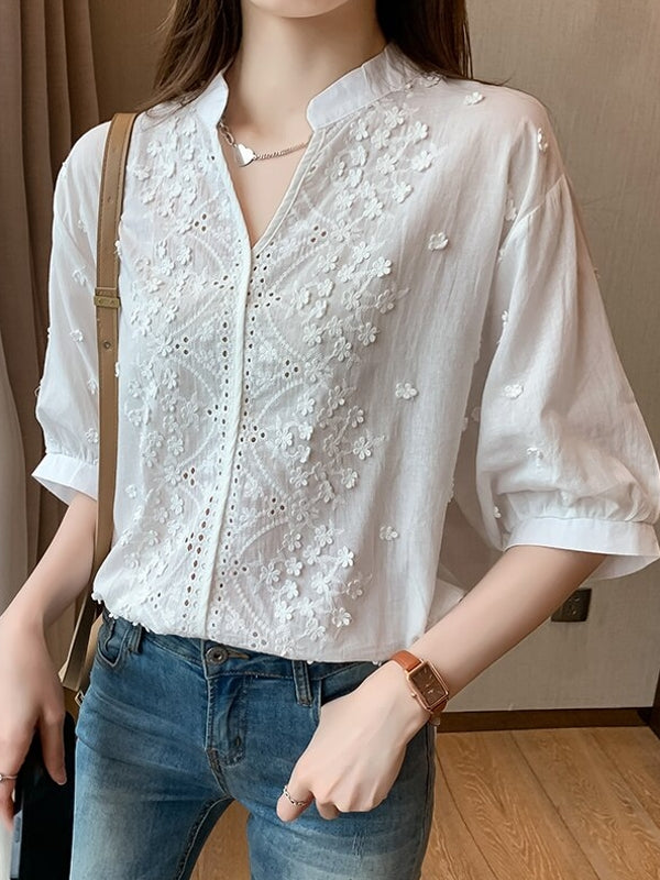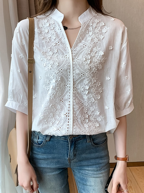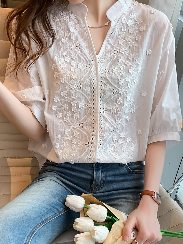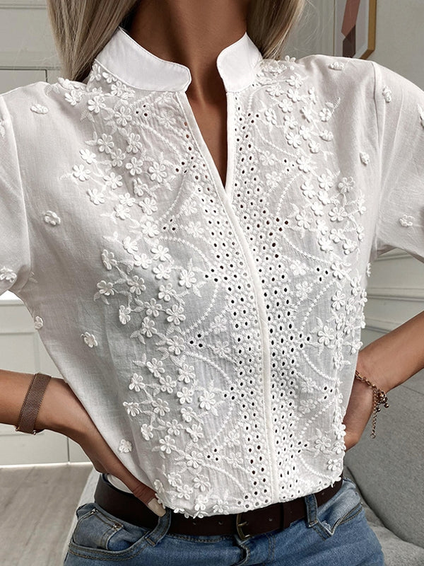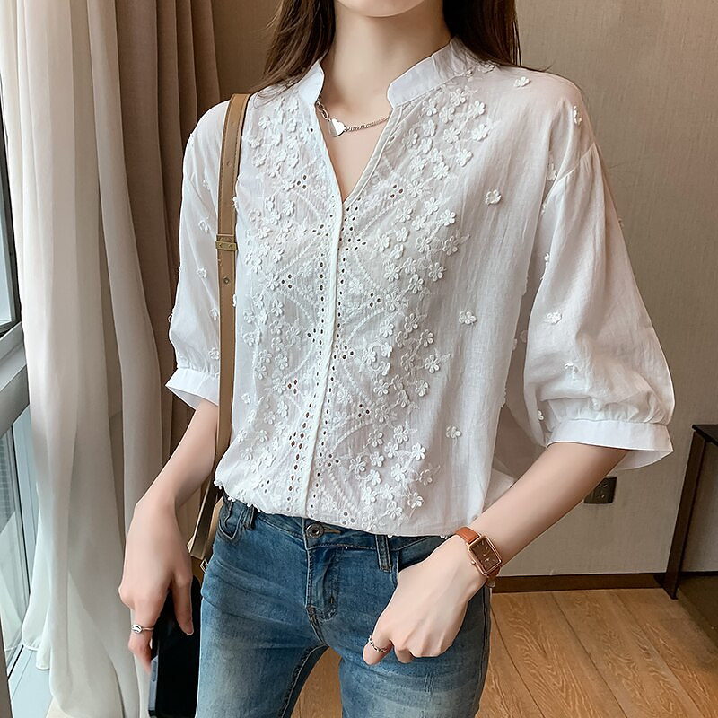 Summer Embroidery Women Blouse Tops V-neck Short Sleeve White Shirt Woman Applique Vintage Cotton Female Blouses