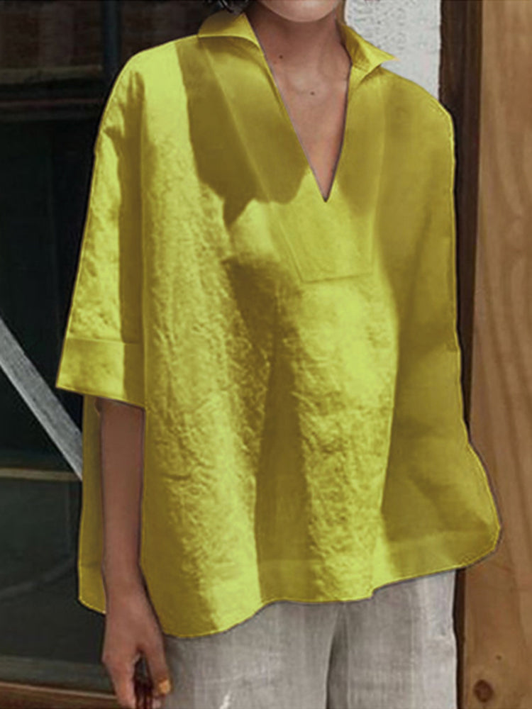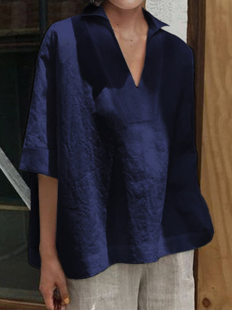 Women Casual Loose Pure Color 3/4 Sleeve V-Neck Blouse